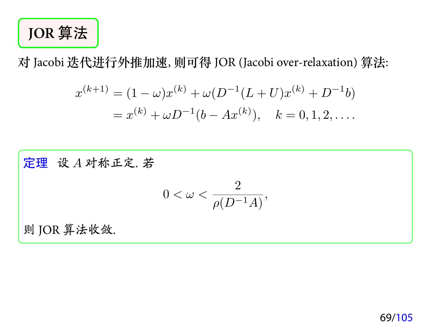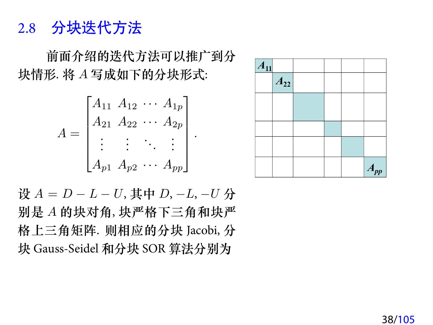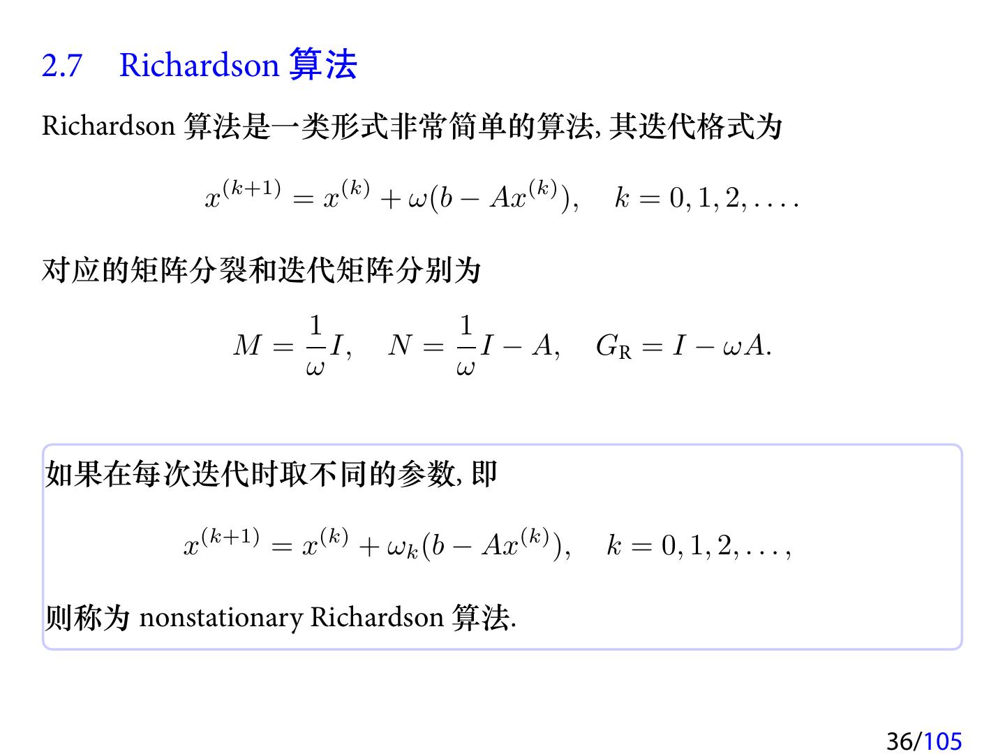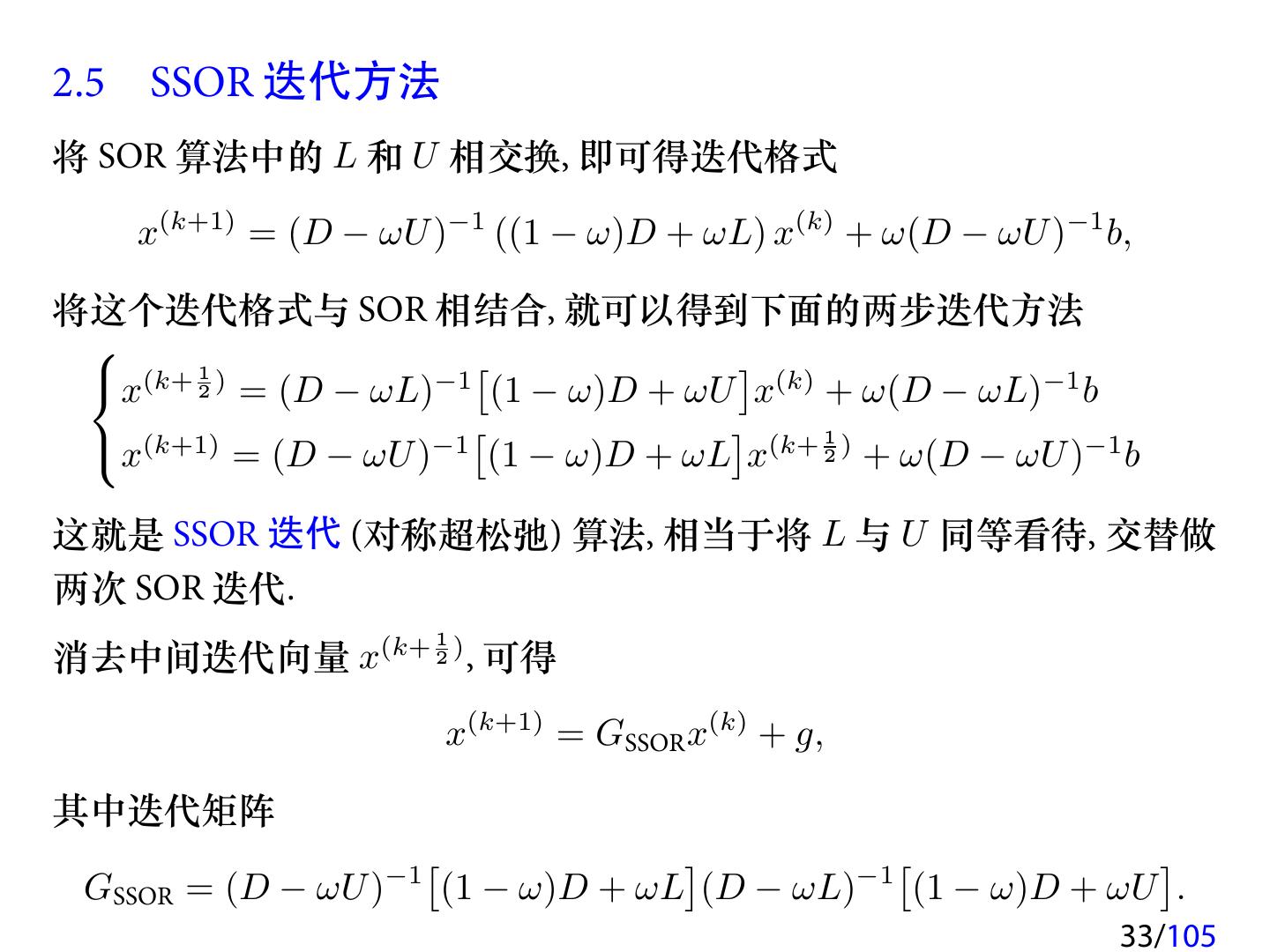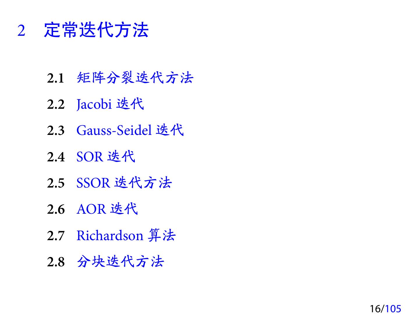 16 .2 定常迭代方法 2.1 矩阵分裂迭代方法 2.2 Jacobi 迭代 2.3 Gauss-Seidel 迭代 2.4 SOR 迭代 2.5 SSOR 迭代方法 2.6 AOR 迭代 2.7 Richardson 算法 2.8 分块迭代方法 16/105