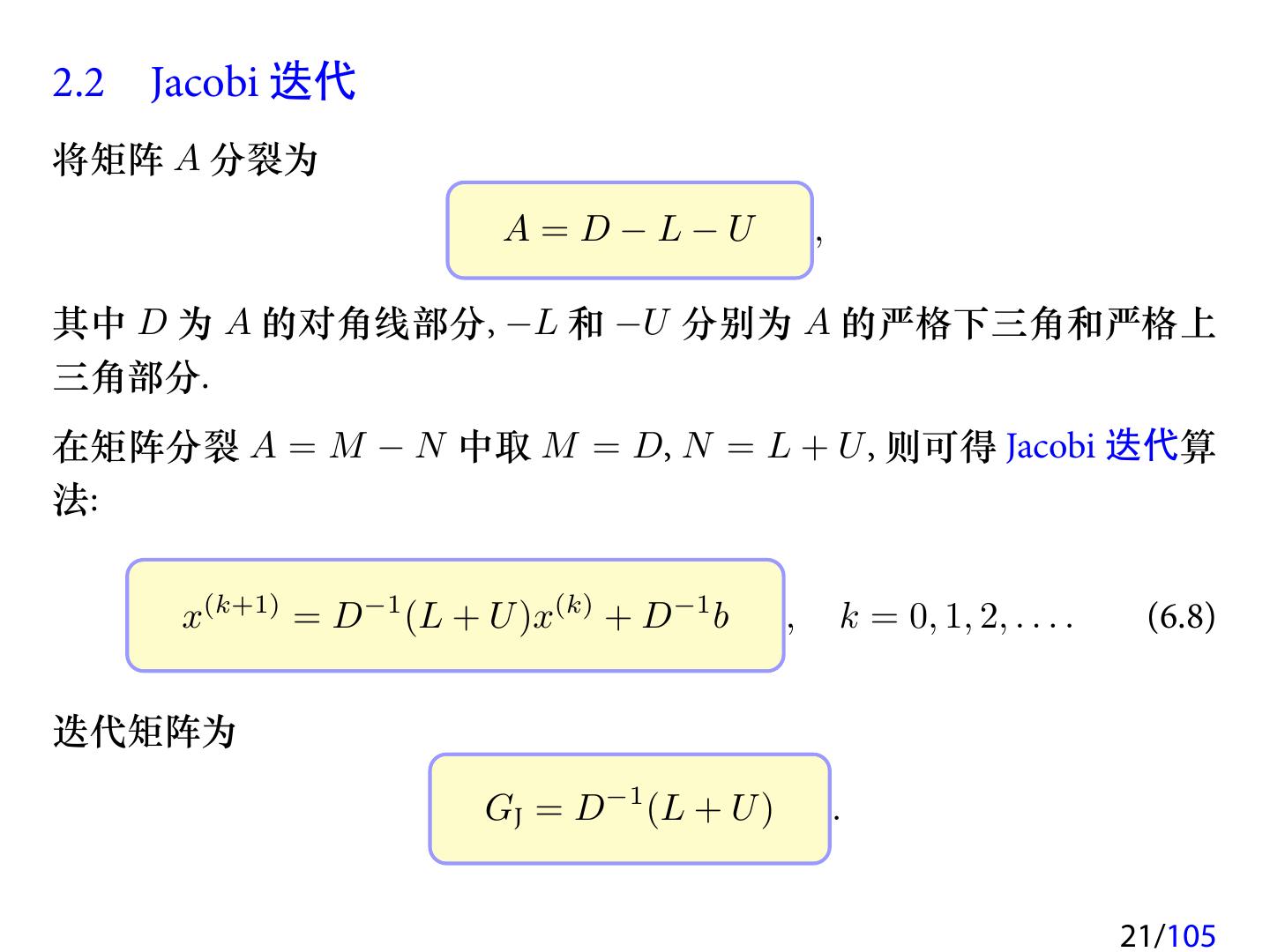 21 .2.2 Jacobi 迭代 将矩阵 A 分裂为 A=D−L−U , 其中 D 为 A 的对角线部分, −L 和 −U 分别为 A 的严格下三角和严格上 三角部分. 在矩阵分裂 A = M − N 中取 M = D, N = L + U , 则可得 Jacobi 迭代算 法: x(k+1) = D−1 (L + U )x(k) + D−1 b , k = 0, 1, 2, . . . . (6.8) 迭代矩阵为 GJ = D−1 (L + U ) . 21/105
