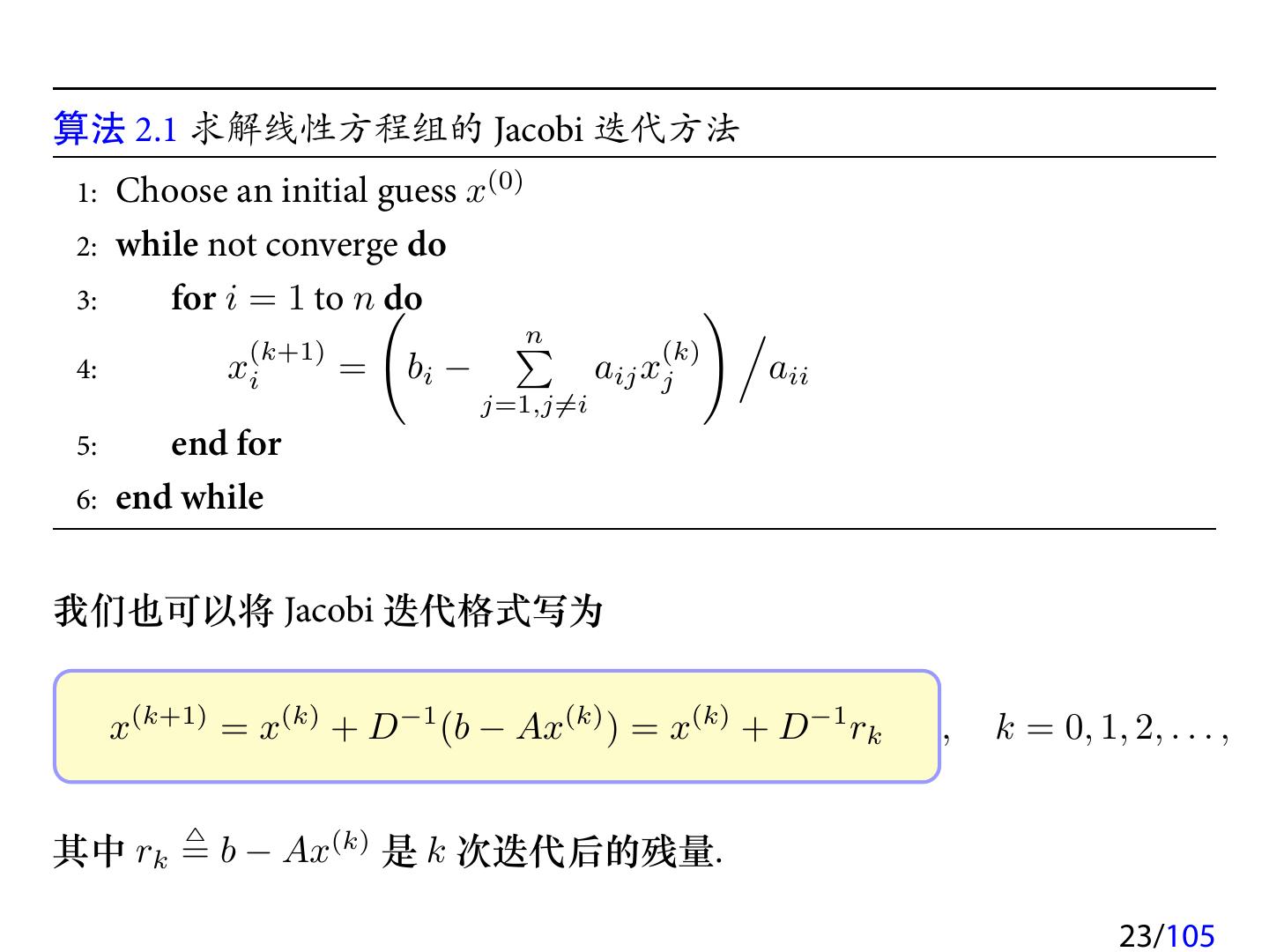 23 .算法 2.1 求解线性方程组的 Jacobi 迭代方法 1: Choose an initial guess x(0) 2: while not converge do 3: for i = 1 to n ( do ) ∑ n / (k+1) (k) 4: xi = bi − aij xj aii j=1,j̸=i 5: end for 6: end while 我们也可以将 Jacobi 迭代格式写为 x(k+1) = x(k) + D−1 (b − Ax(k) ) = x(k) + D−1 rk , k = 0, 1, 2, . . . , △ 其中 rk = b − Ax(k) 是 k 次迭代后的残量. 23/105