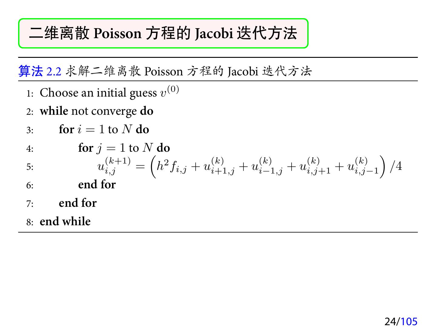 24 . 二维离散 Poisson 方程的 Jacobi 迭代方法 算法 2.2 求解二维离散 Poisson 方程的 Jacobi 迭代方法 1: Choose an initial guess v (0) 2: while not converge do 3: for i = 1 to N do 4: for j = 1 to N(do ) (k+1) (k) (k) (k) (k) 5: ui,j = h2 fi,j + ui+1,j + ui−1,j + ui,j+1 + ui,j−1 /4 6: end for 7: end for 8: end while 24/105