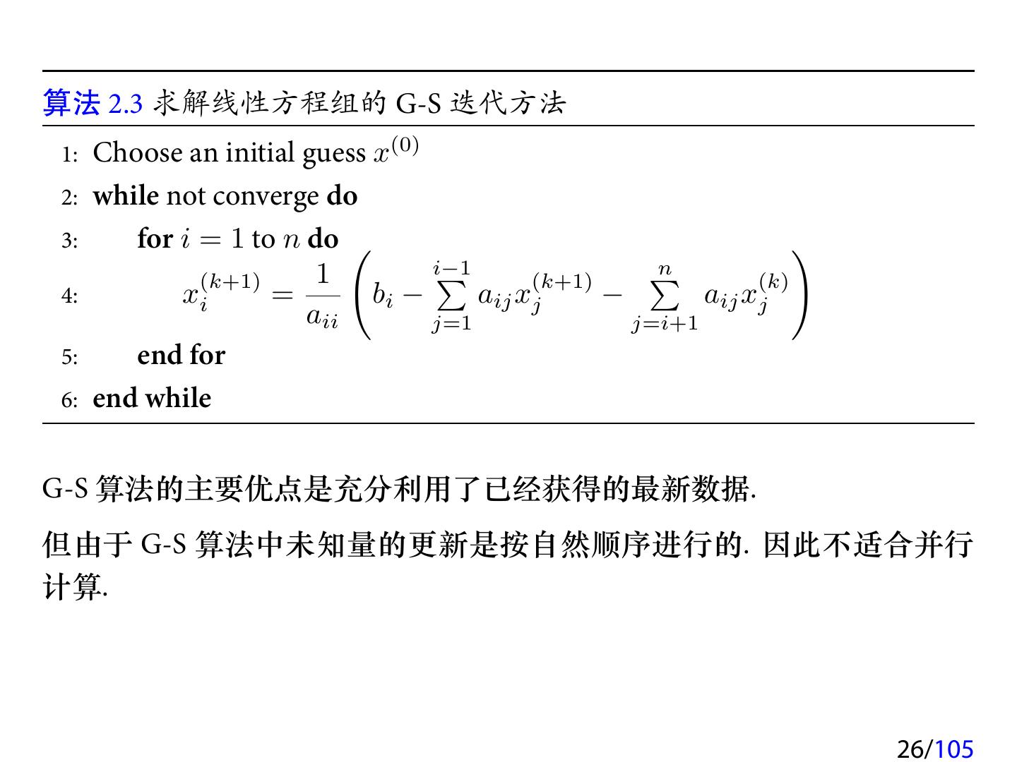 26 .算法 2.3 求解线性方程组的 G-S 迭代方法 1: Choose an initial guess x(0) 2: while not converge do 3: for i = 1 to n do ( ) (k+1) 1 ∑ i−1 (k+1) ∑n (k) 4: xi = bi − aij xj − aij xj aii j=1 j=i+1 5: end for 6: end while G-S 算法的主要优点是充分利用了已经获得的最新数据. 但由于 G-S 算法中未知量的更新是按自然顺序进行的. 因此不适合并行 计算. 26/105