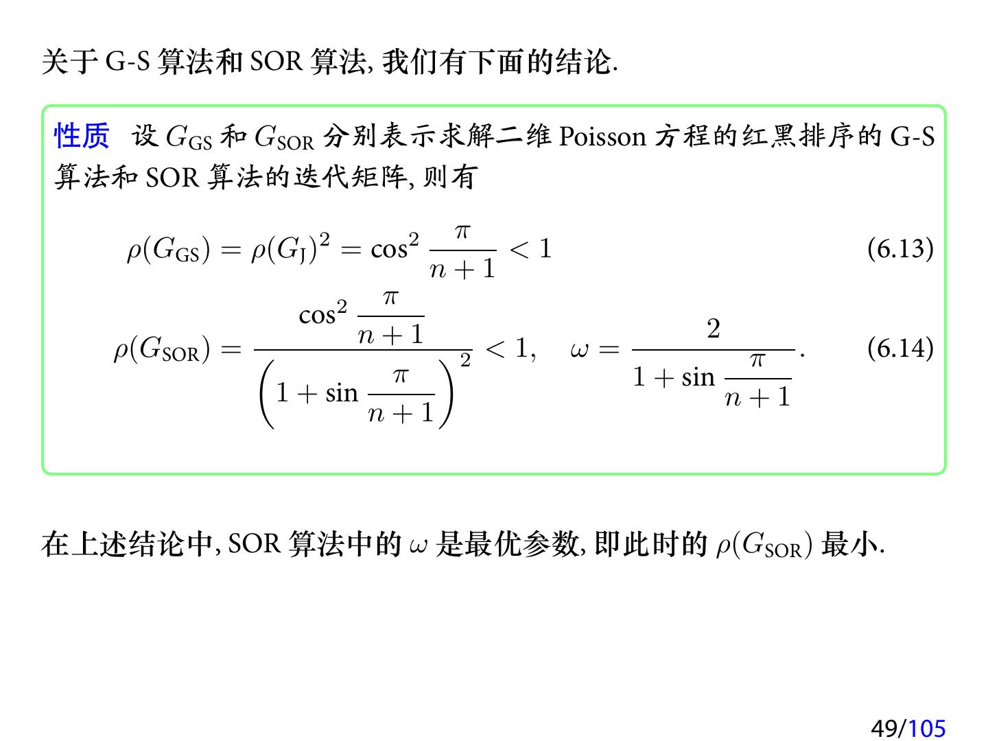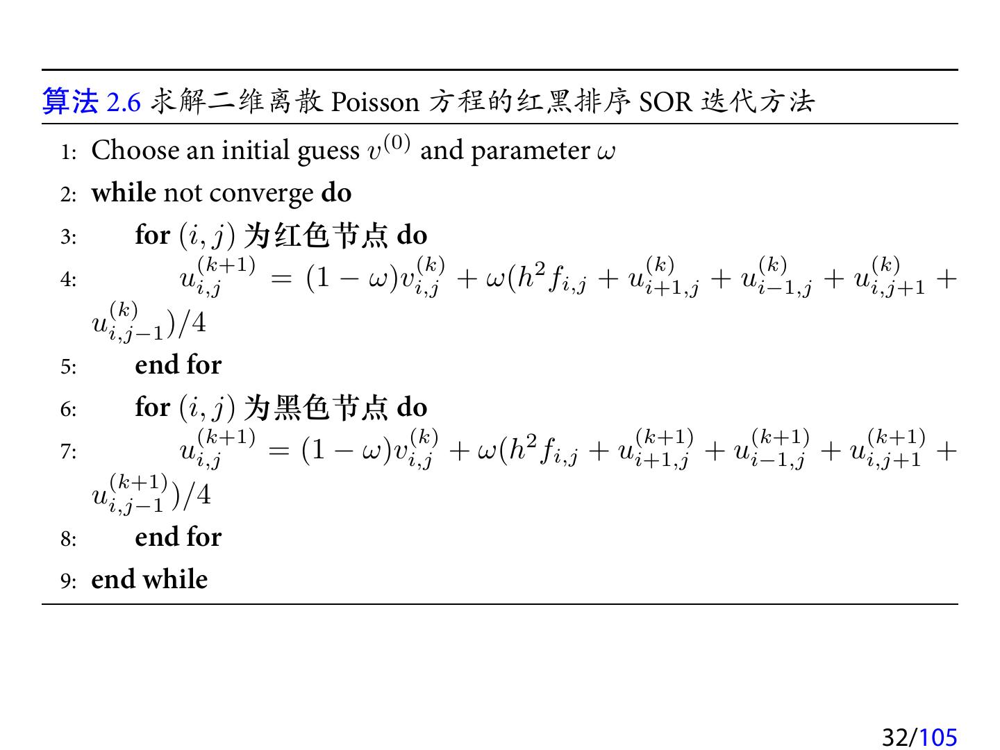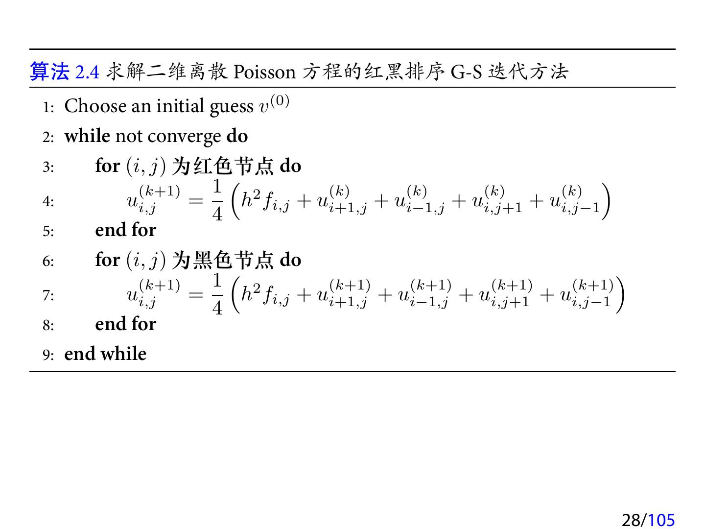 28 .算法 2.4 求解二维离散 Poisson 方程的红黑排序 G-S 迭代方法 1: Choose an initial guess v (0) 2: while not converge do 3: for (i, j) 为红色节点 do (k+1) 1( 2 (k) (k) (k) (k) ) 4: ui,j = h fi,j + ui+1,j + ui−1,j + ui,j+1 + ui,j−1 4 5: end for 6: for (i, j) 为黑色节点 do (k+1) 1( 2 (k+1) (k+1) (k+1) (k+1) ) 7: ui,j = h fi,j + ui+1,j + ui−1,j + ui,j+1 + ui,j−1 4 8: end for 9: end while 28/105
