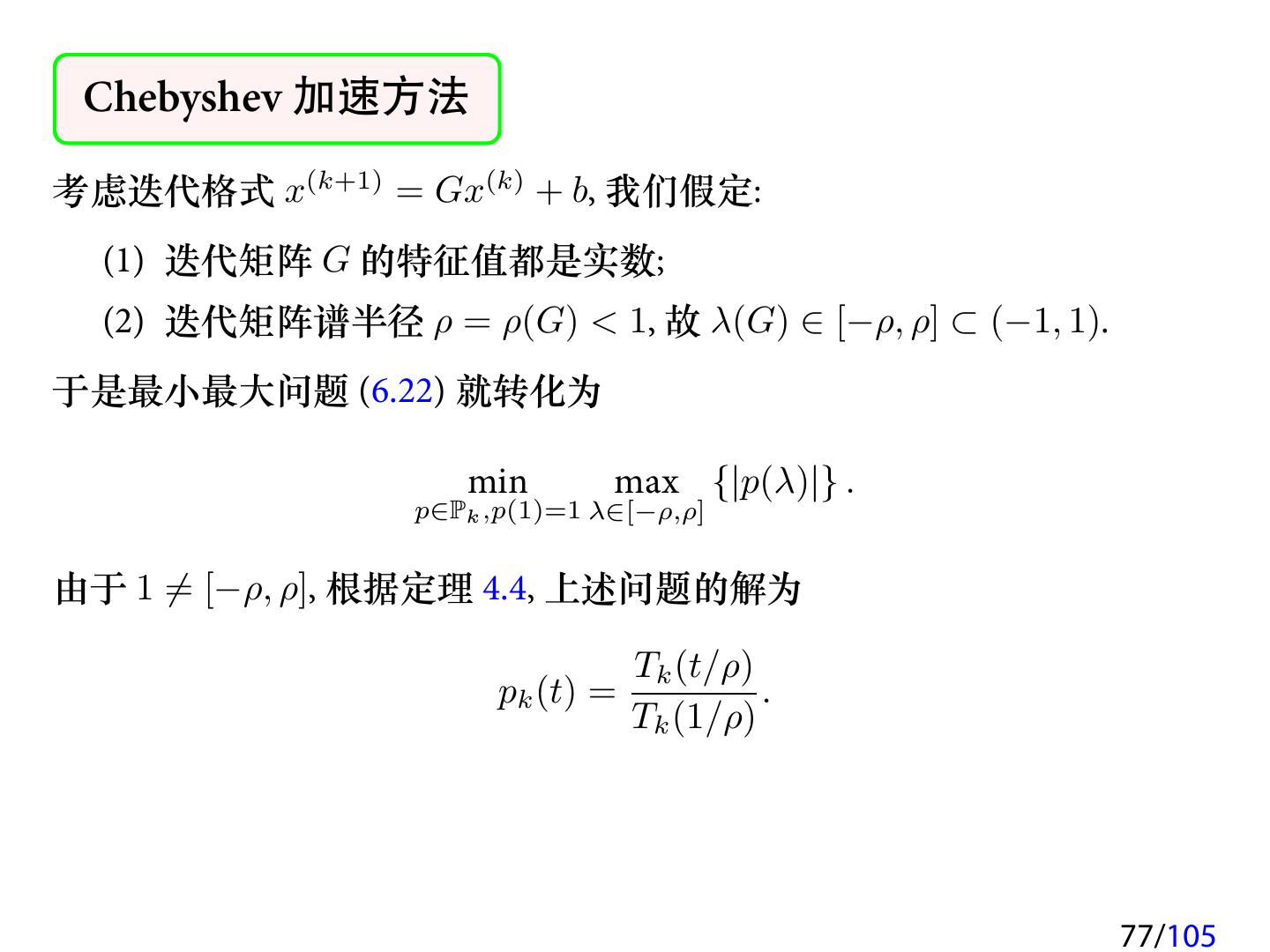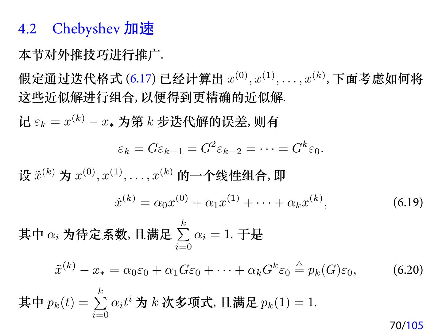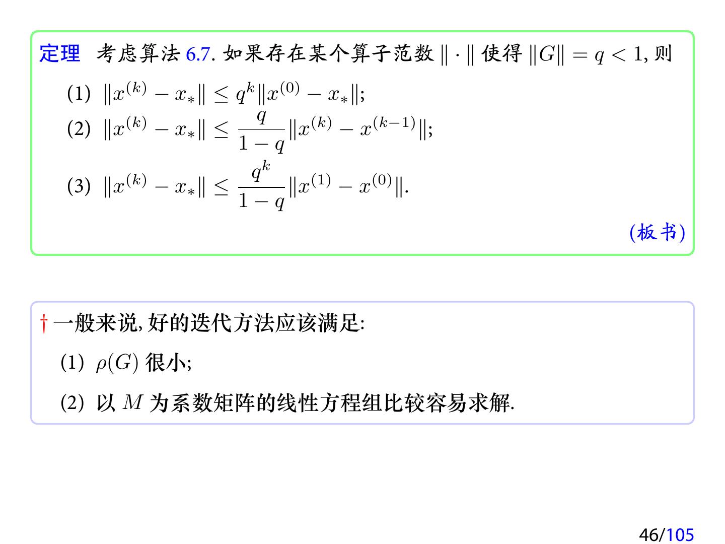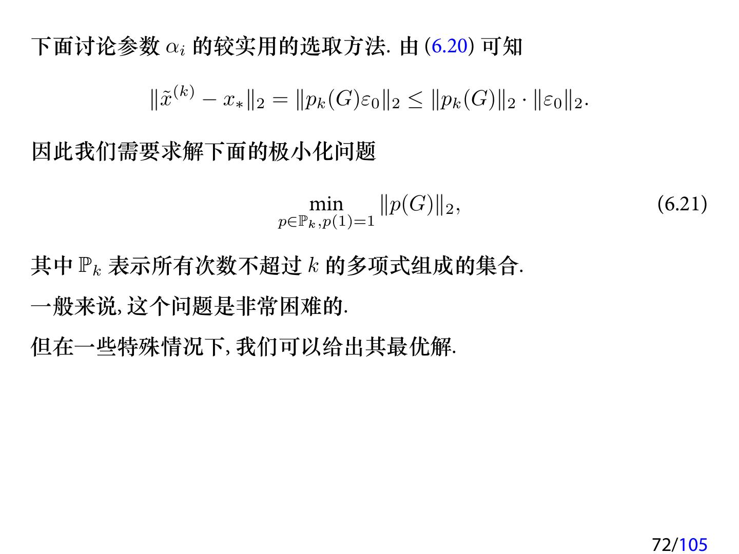 17 .当直接求解方程组 Ax = b 较困难时, 我们可以求解一个近似方程组 M x = b. 设其解为 x(1) . 易知它与真解之间的误差满足 A(x∗ − x(1) ) = b − Ax(1) . 如果 x(1) 已经满足精度要求, 则停止计算, 否则需要修正. 设修正量为 ∆x. 显然 ∆x 满足方程 A∆x = b − Ax(1) . 但由于直接求解该 方程比较困难, 因此我们还是求解近似 M ∆x = b − Ax(1) . 于是得到修正后的近似解 x(2) = x(1) + ∆x = x(1) + M −1 (b − Ax(1) ). 若 x(2) 已经满足精度要求, 则停止计算, 否则继续按以上的方式进行修正. 17/105