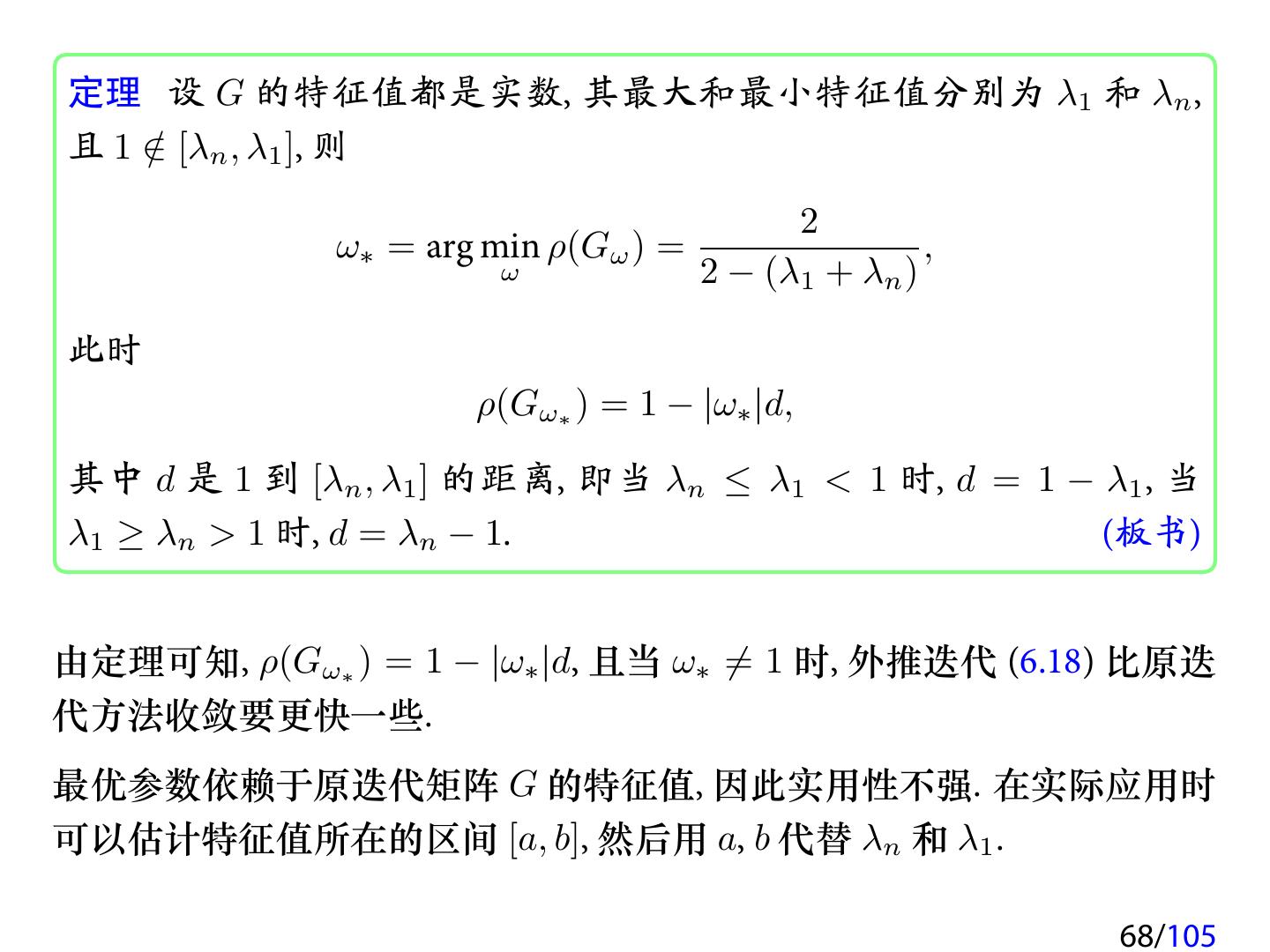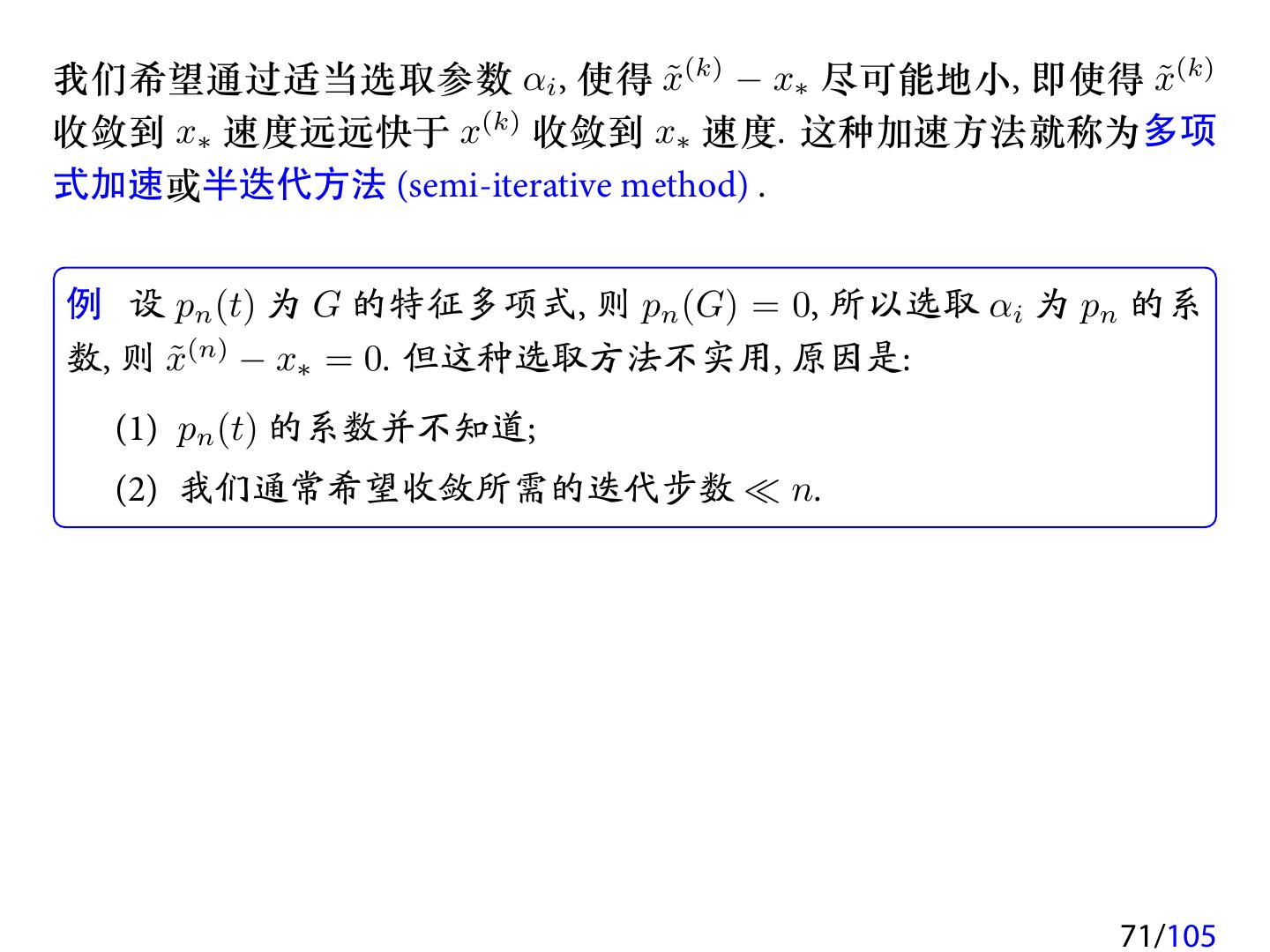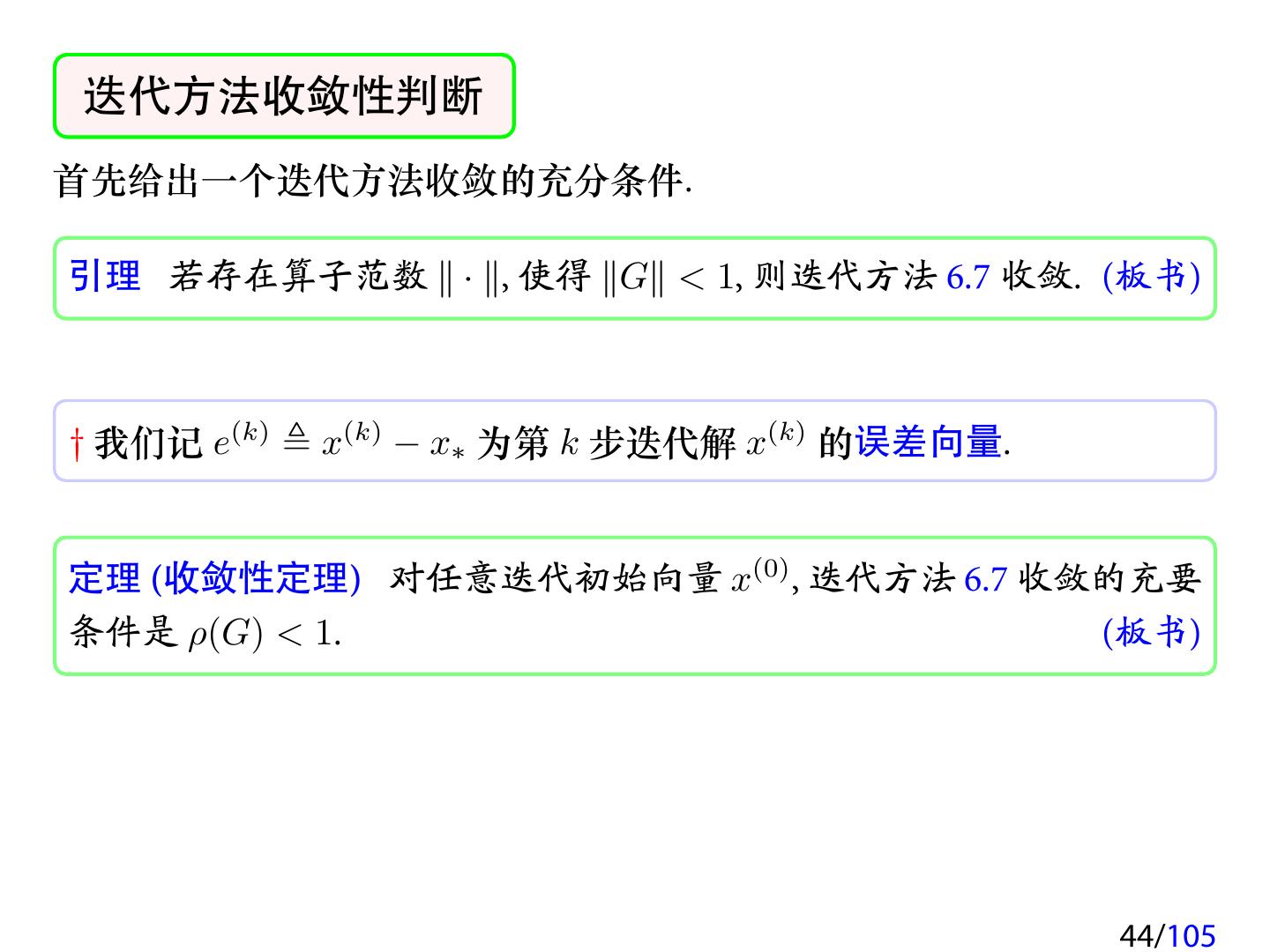 17 .当直接求解方程组 Ax = b 较困难时, 我们可以求解一个近似方程组 M x = b. 设其解为 x(1) . 易知它与真解之间的误差满足 A(x∗ − x(1) ) = b − Ax(1) . 如果 x(1) 已经满足精度要求, 则停止计算, 否则需要修正. 设修正量为 ∆x. 显然 ∆x 满足方程 A∆x = b − Ax(1) . 但由于直接求解该 方程比较困难, 因此我们还是求解近似 M ∆x = b − Ax(1) . 于是得到修正后的近似解 x(2) = x(1) + ∆x = x(1) + M −1 (b − Ax(1) ). 若 x(2) 已经满足精度要求, 则停止计算, 否则继续按以上的方式进行修正. 17/105