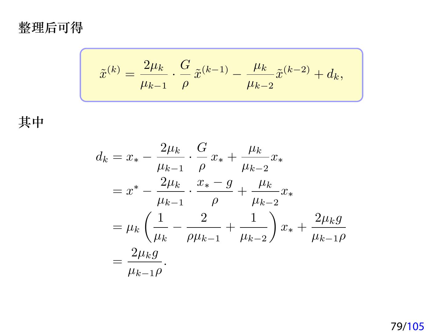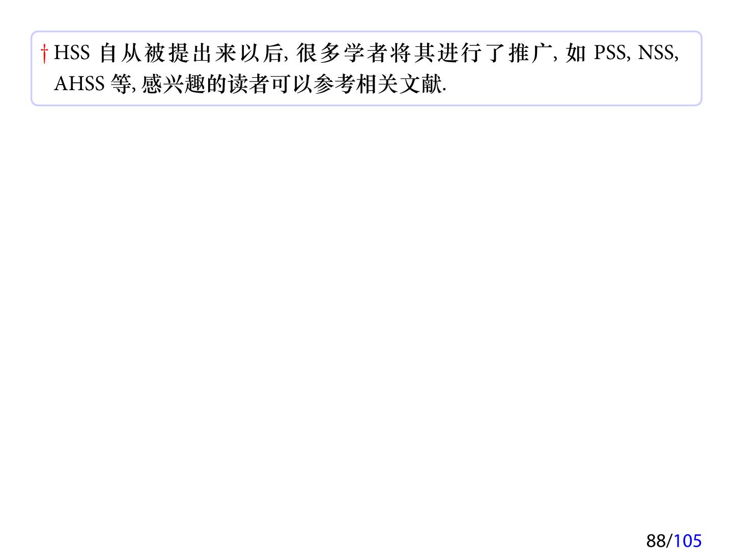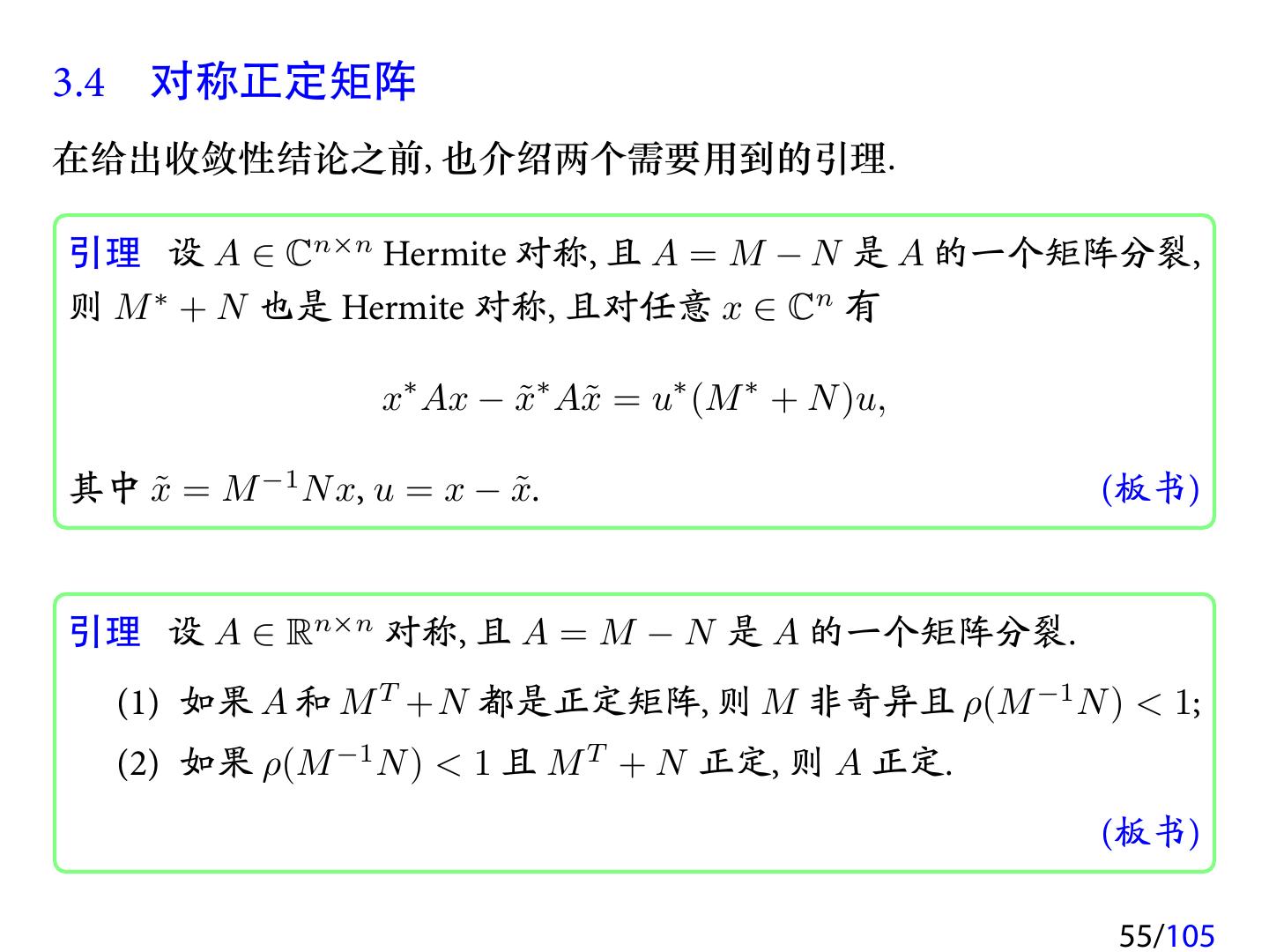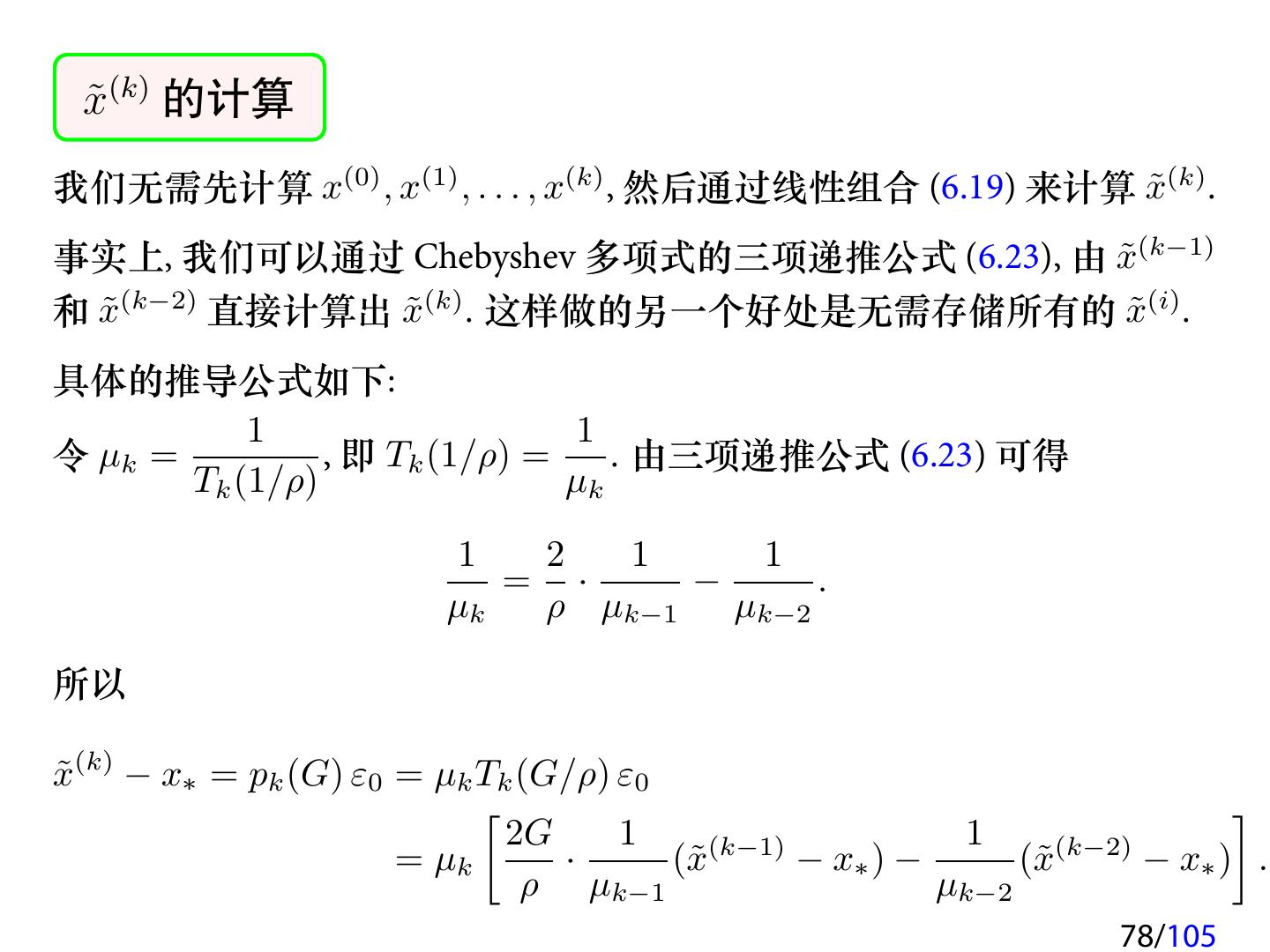17 .当直接求解方程组 Ax = b 较困难时, 我们可以求解一个近似方程组 M x = b. 设其解为 x(1) . 易知它与真解之间的误差满足 A(x∗ − x(1) ) = b − Ax(1) . 如果 x(1) 已经满足精度要求, 则停止计算, 否则需要修正. 设修正量为 ∆x. 显然 ∆x 满足方程 A∆x = b − Ax(1) . 但由于直接求解该 方程比较困难, 因此我们还是求解近似 M ∆x = b − Ax(1) . 于是得到修正后的近似解 x(2) = x(1) + ∆x = x(1) + M −1 (b − Ax(1) ). 若 x(2) 已经满足精度要求, 则停止计算, 否则继续按以上的方式进行修正. 17/105