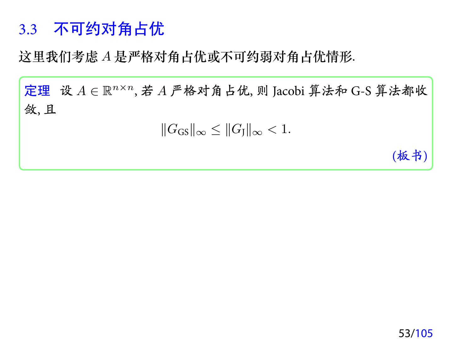 22 .写成分量形式即为 1 ∑ n aij xj (k+1) (k) xi = bi − , i = 1, 2, . . . , n. aii j=1,j̸=i (k+1) † 由于 Jacobi 迭代中 xi 的更新顺序与 i 无关, 即可以按顺序 i = 1, 2, . . . , n 计算, 也可以按顺序 i = n, n − 1, . . . , 2, 1 计算, 或者乱序 计算. 因此 Jacobi 迭代非常适合并行计算. 22/105