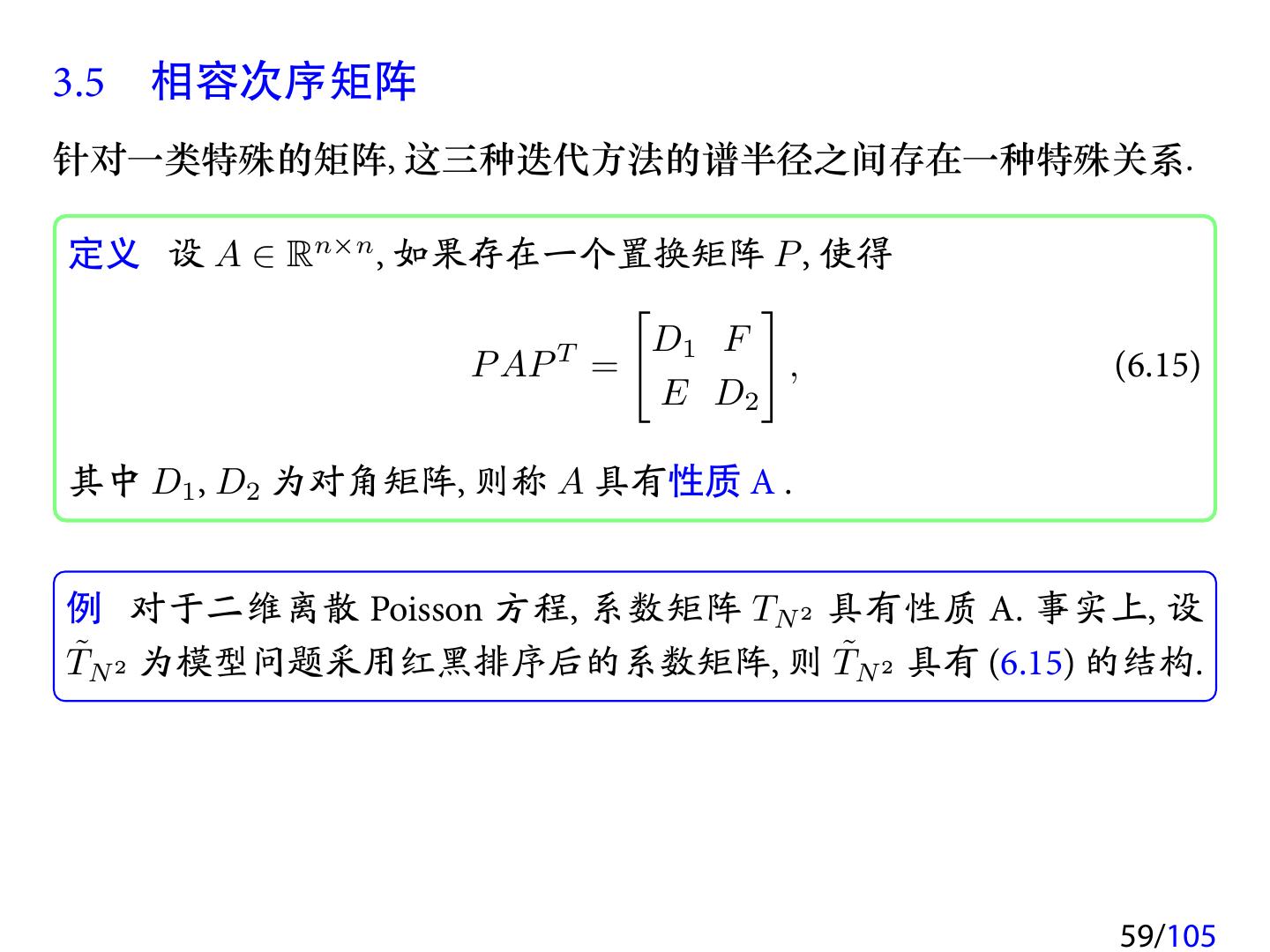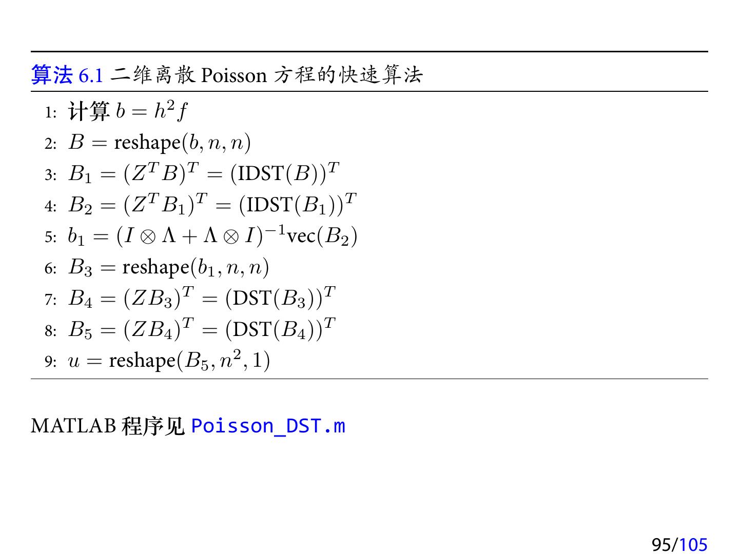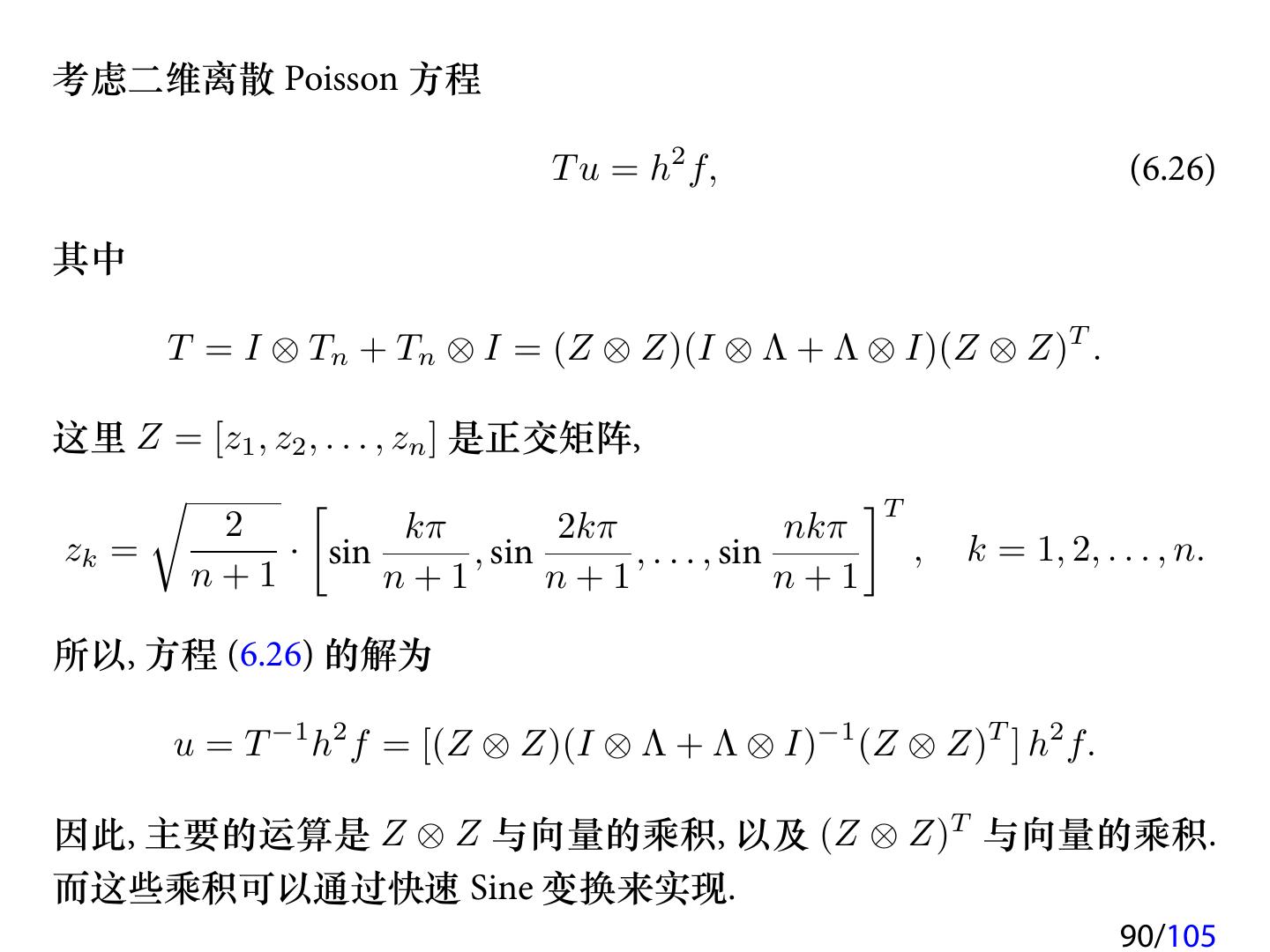 13 .写成矩阵形式即为 T u = h2 f, (6.5) 其中 △ T = I ⊗ Tn + Tn ⊗ I, u = [u1,1 , . . . , un,1 , u1,2 , . . . , un,2 , . . . , u1,n , . . . , un,n ]. † 在后面介绍的算法时, 我们都以二维离散 Poisson 方程 (6.5) 为例. 13/105