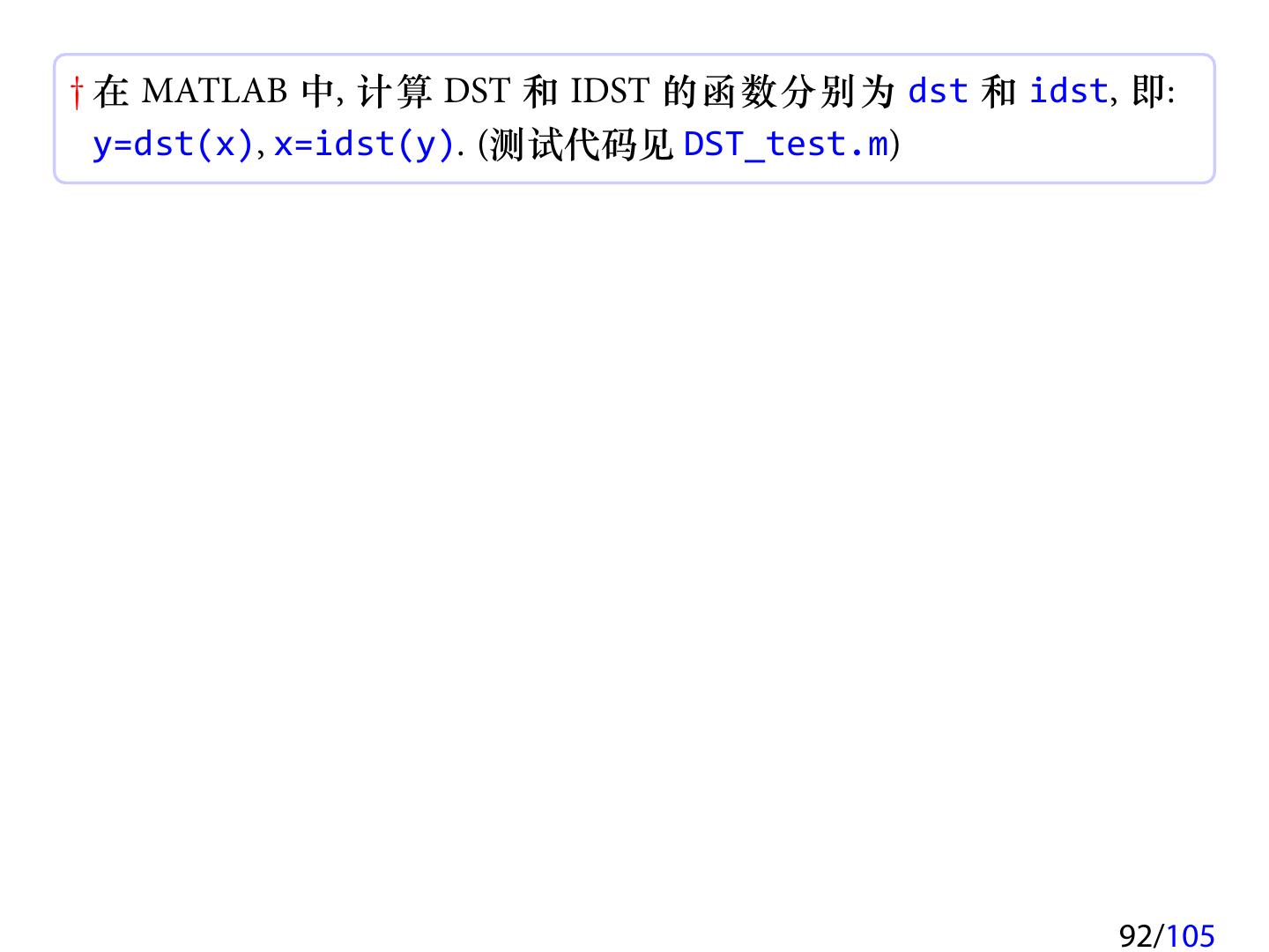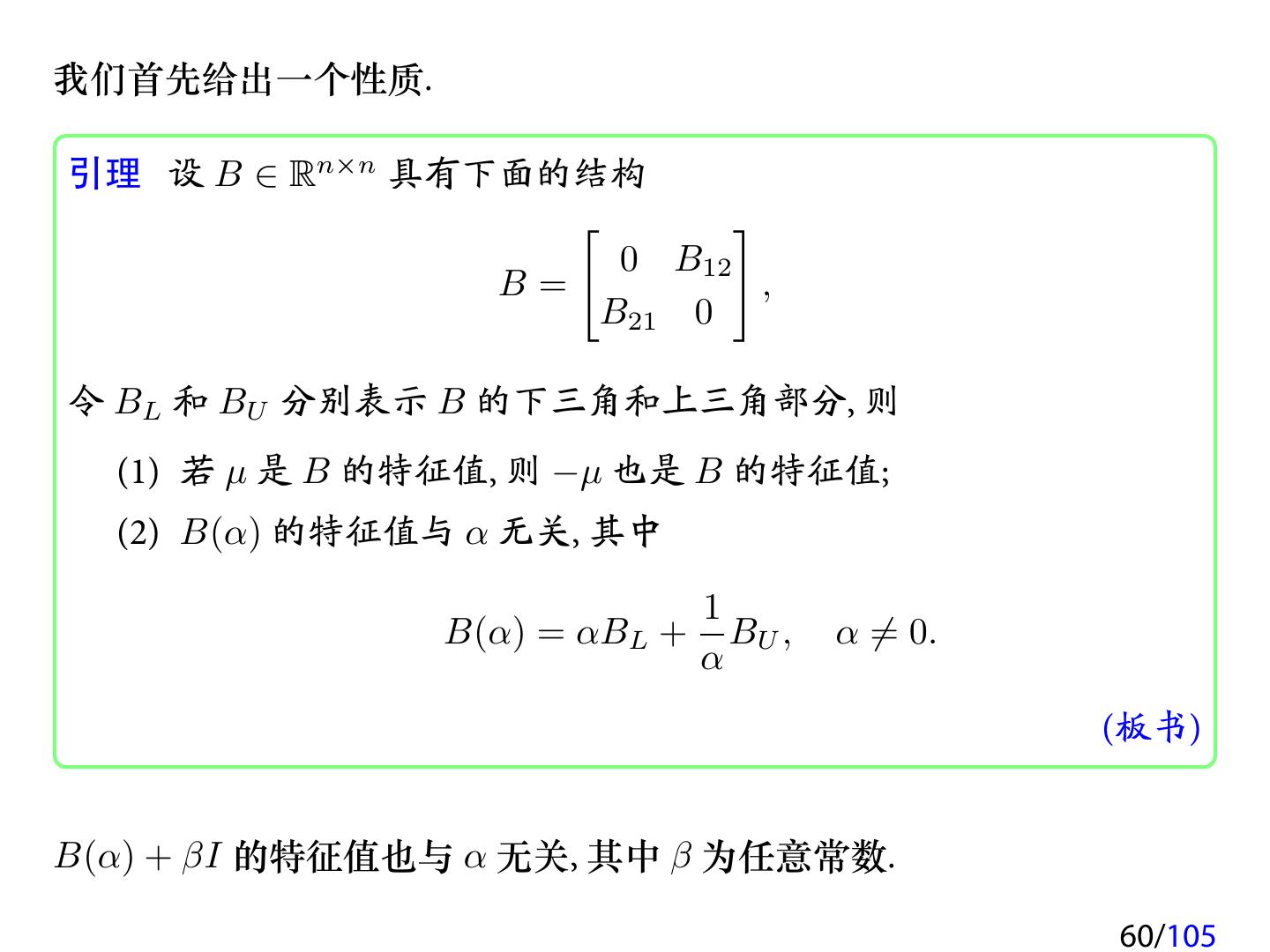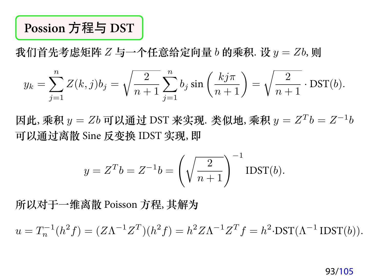 8 .引理 更一般地, 设 T = tridiag(a, b, c) ∈ Rn×n , 则 T 的特征值为 √ kπ λk = b − 2 ac cos , k = 1, 2, . . . , n, n+1 对应的特征向量为 zk , 其第 j 个分量为 ( a ) 2j jkπ zk (j) = sin . c n+1 特别地, 若 a = c = 1, 则对应的单位特征向量为 √ [ ]T 2 kπ 2kπ nkπ zk = · sin , sin , . . . , sin . n+1 n+1 n+1 n+1 (证明留作练习) 8/105