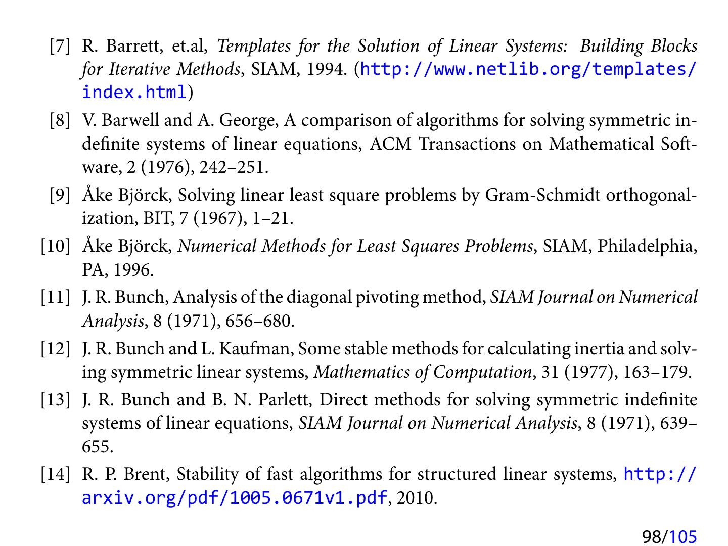 2 .求解线性方程组的常用方法有: • 直接法 : PLU 分解, LDLT 分解, Cholesky 分解等 • 迭代法 : - 经典 (定常, 不动点) 迭代法: Jacobi/Gauss-Seidel, SOR, AOR 等 - Krylov 子空间迭代法: CG, MIRES, GMRES, BiCGStab 等 • 快速算法 : - 基于快速变换, 如 FFT, DCT, DST 等 - 代数多重网格法 (Algebraic multigrid) - 快速多极子算法 (Fast multipole) 有些方法可能只是对某类方程有效, 如快速算法. 在实际应用中, 这些方 法可以结合使用, 如混合 (hybrid) 算法, 预处理算法 (preconditioning) 等. 2/105