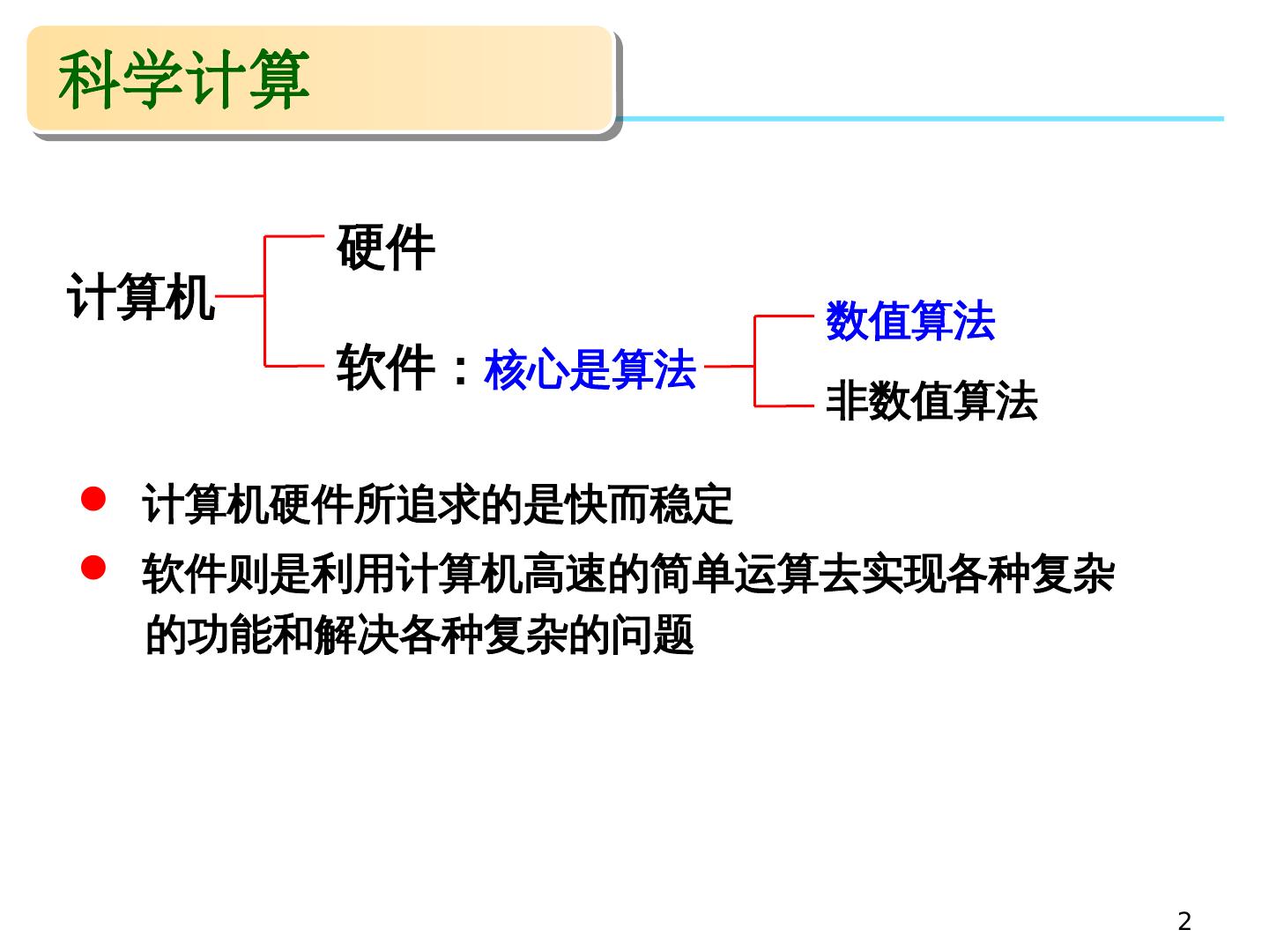 2 .科学计算 计算机 硬件 软件: 核心是算法 数值算法 非数值算法 计算机硬件所追求的是快而稳定 软件则是利用计算机高速的简单运算去 实现各种复杂 的功能 和 解决 各种复杂的问题 2