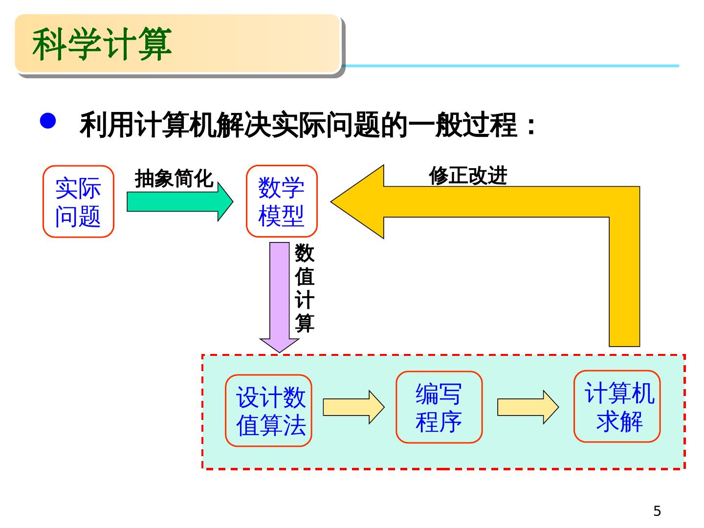 5 .科学计算 5 利用计算机解决实际问题的一般过程: 抽象简化 数 值 计 算 修正改进 实际 问题 数学 模型 设计数 值算法 编写 程序 计算机 求解