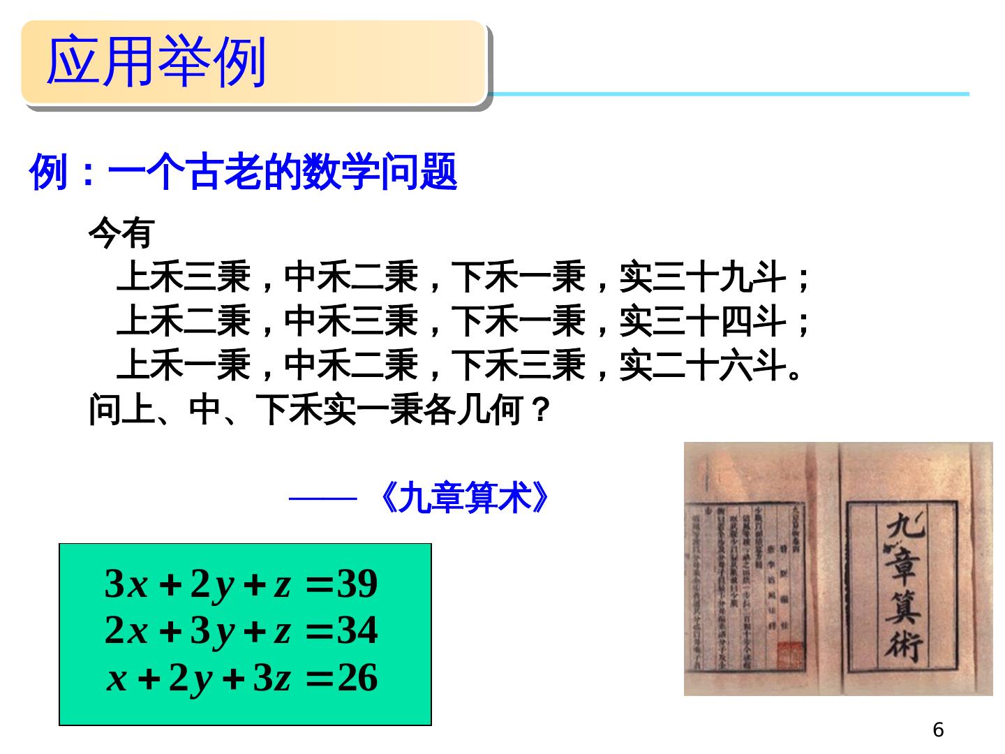 6 .应用举例 6 今 有 上禾三秉,中禾二秉,下禾一秉,实三十九斗; 上禾二秉,中禾三秉,下禾一秉,实三十四斗; 上禾一秉,中禾二秉,下禾三秉,实二十六斗。 问上、中、下禾实一秉各几何? —— 《 九章算术 》 例:一个古老的数学问题
