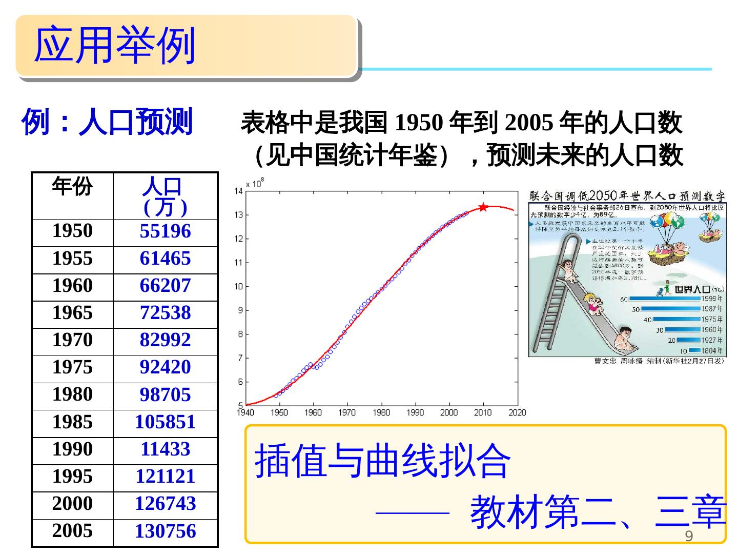 9 .应用举例 9 例:人口预测 表格中是我国 1950 年到 2005 年的人口 数 ( 见中国统计年鉴 ),预测 未来的人口数 年份 人口 ( 万 ) 1950 55196 1955 61465 1960 66207 1965 72538 1970 82992 1975 92420 1980 98705 1985 105851 1990 11433 1995 121121 2000 126743 2005 130756 插值 与 曲线拟合 —— 教材第二、三章