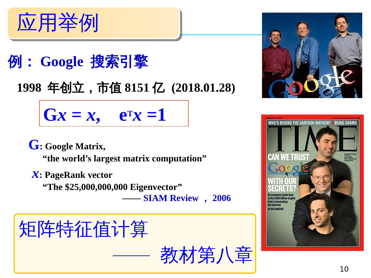 10 .应用举例 10 例:G oogle 搜索引擎 1998 年创立, 市值 8151 亿 ( 2018.01.28) G : Google Matrix, “the world’s largest matrix computation” x : PageRank vector “ The $25,000,000,000 Eigenvector” —— SIAM Review , 2006 G x = x , e T x =1 矩阵特征值计算 —— 教材第八 章