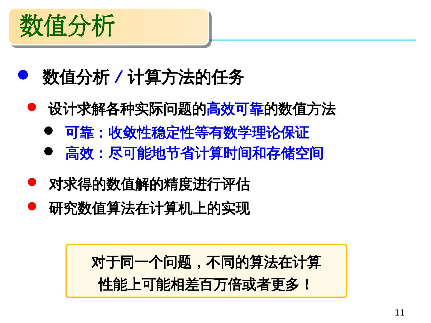 11 .数值分析 11 数值分析 / 计算方法的任务 设计求解各种实际问题的 高效可靠 的数值方法 可靠 :收敛性稳定性等有数学理论保证 高效:尽可能地节省计算时间和 存储空间 对求得的 数值 解的精度进行评估 研究数值算法 在计算机上 的 实现 对于同一个问题,不同的算法在计算 性能上可能相差百万倍或者更多!