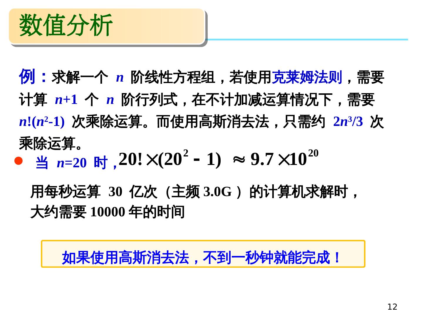 12 .数值分析 12 例: 求解一个 n 阶线性方程组 ,若使用 克莱姆法则 ,需要计算 n +1 个 n 阶行列式,在不计加减运算情况下 ,需要 n !( n 2 -1) 次乘除运算。而使用高斯消去法,只需 约 2 n 3 /3 次乘除 运算。 用每秒运算 30 亿次(主频 3.0G) 的计算机求解时,大约需要10000年的时间 当 n =20 时, 如果使用高斯消去法,不到一秒钟就能完成!