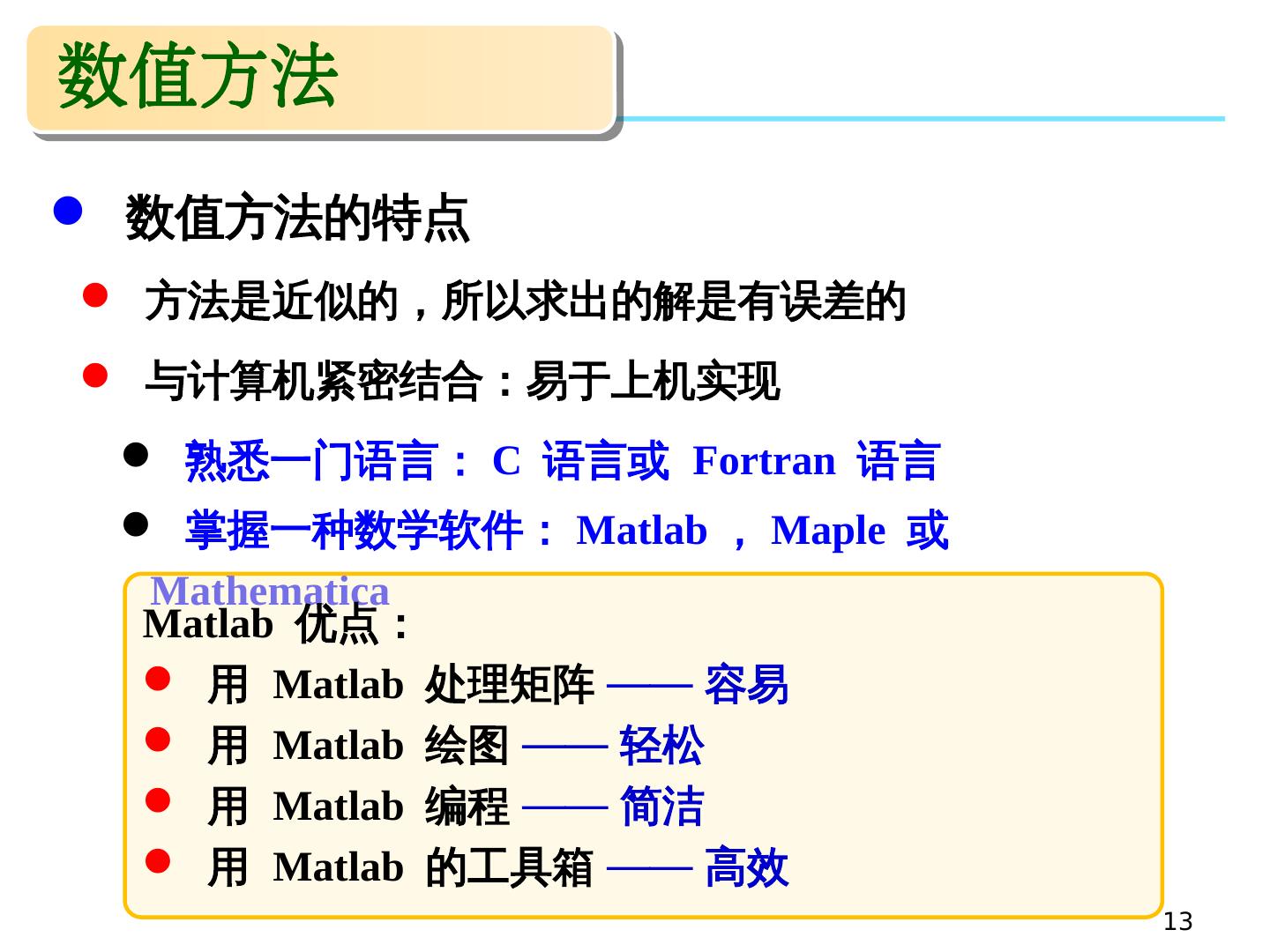13 .数值方法 13 数值方法的特点 方法是近似的 ,所以求出的解是有误差的 与计算机紧密结合 :易于上机 实现 熟悉一门语言: C 语言或 Fortran 语言 掌握一种数学软件: Matlab , Maple 或 Mathematica Matlab 优点: 用 Matlab 处理矩阵 —— 容易 用 Matlab 绘图 —— 轻松 用 Matlab 编程 —— 简洁 用 Matlab 的工具箱 —— 高效
