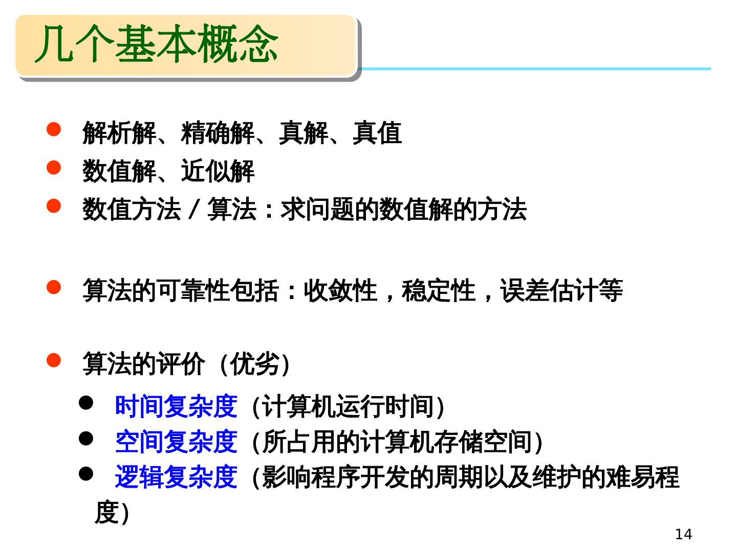 14 .几个基本概念 14 解析解、精确解、真解、真值 数值解、近似解 数值方法 / 算法:求问题的数值解的方法 算法的可靠性包括:收敛性,稳定性,误差估计等 算法的评价(优劣) 时间复杂度 (计算机运行时间) 空间复杂度 (所占用的计算机存储空间) 逻辑复杂度 (影响程序开发的周期以及维护的难易程度)