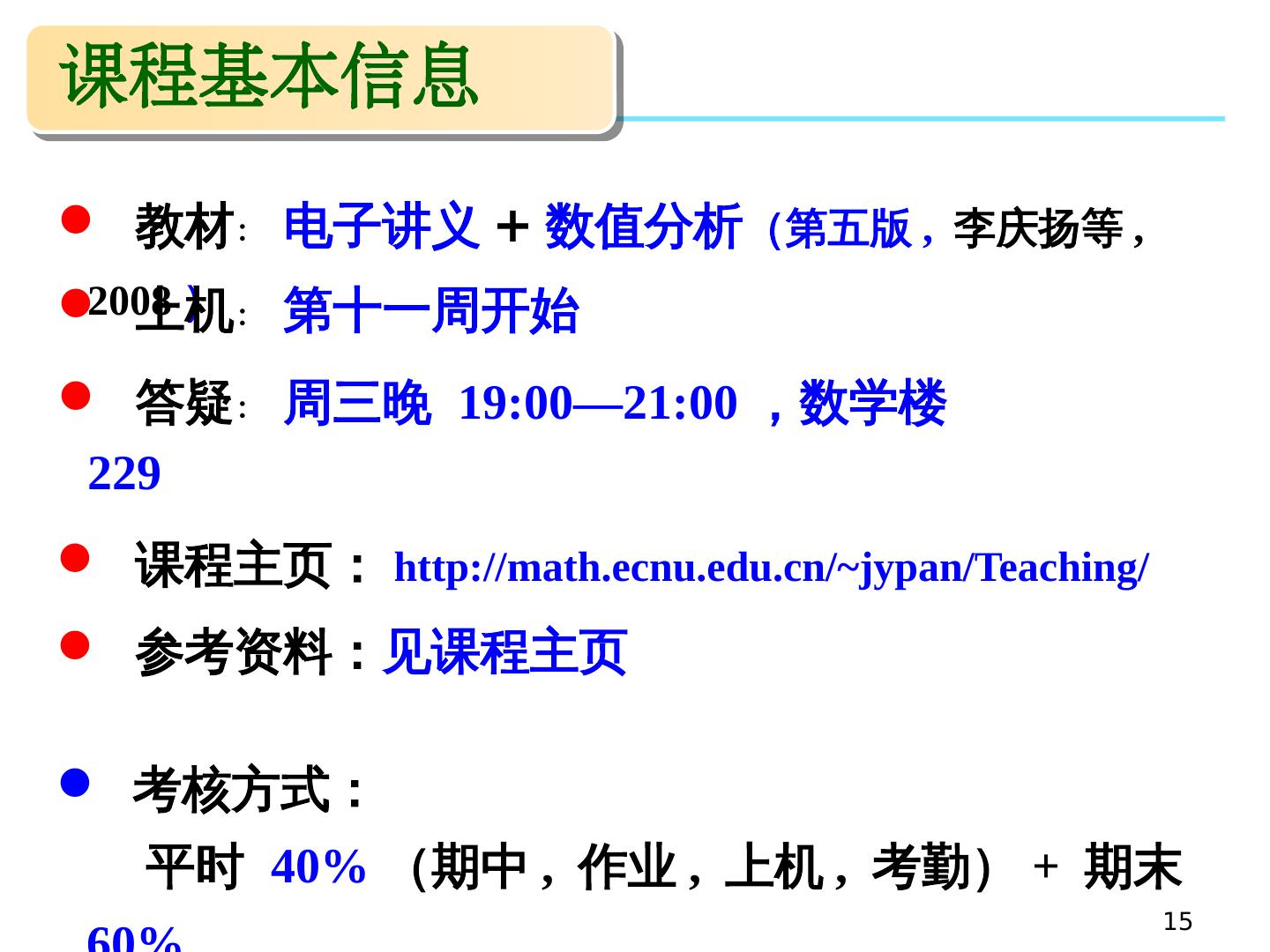 15 .课程基本信息 15 教材 : 电子讲义 + 数值分析 (第五 版 , 李 庆扬 等 , 2008 ) 上机 : 第十一周开始 课程主页 : http ://math.ecnu.edu.cn/~jypan/Teaching / 参考资料: 见课程主页 考核方式 : 平时 40% (期 中 , 作业 , 上机 , 考勤) + 期末 60% 答疑 : 周三晚 19:00—21:00 ,数学楼 229