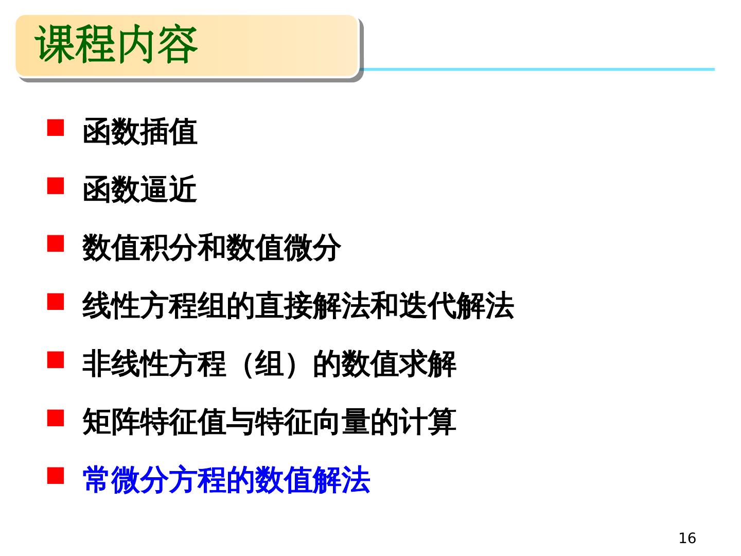 16 .课程内容 16 函数插值 函数逼近 数值积分和数值微分 线性方程组的直接解法和迭代解法 非线性方程(组)的数值求解 矩阵特征值与特征向量的计算 常微分方程的数值解法
