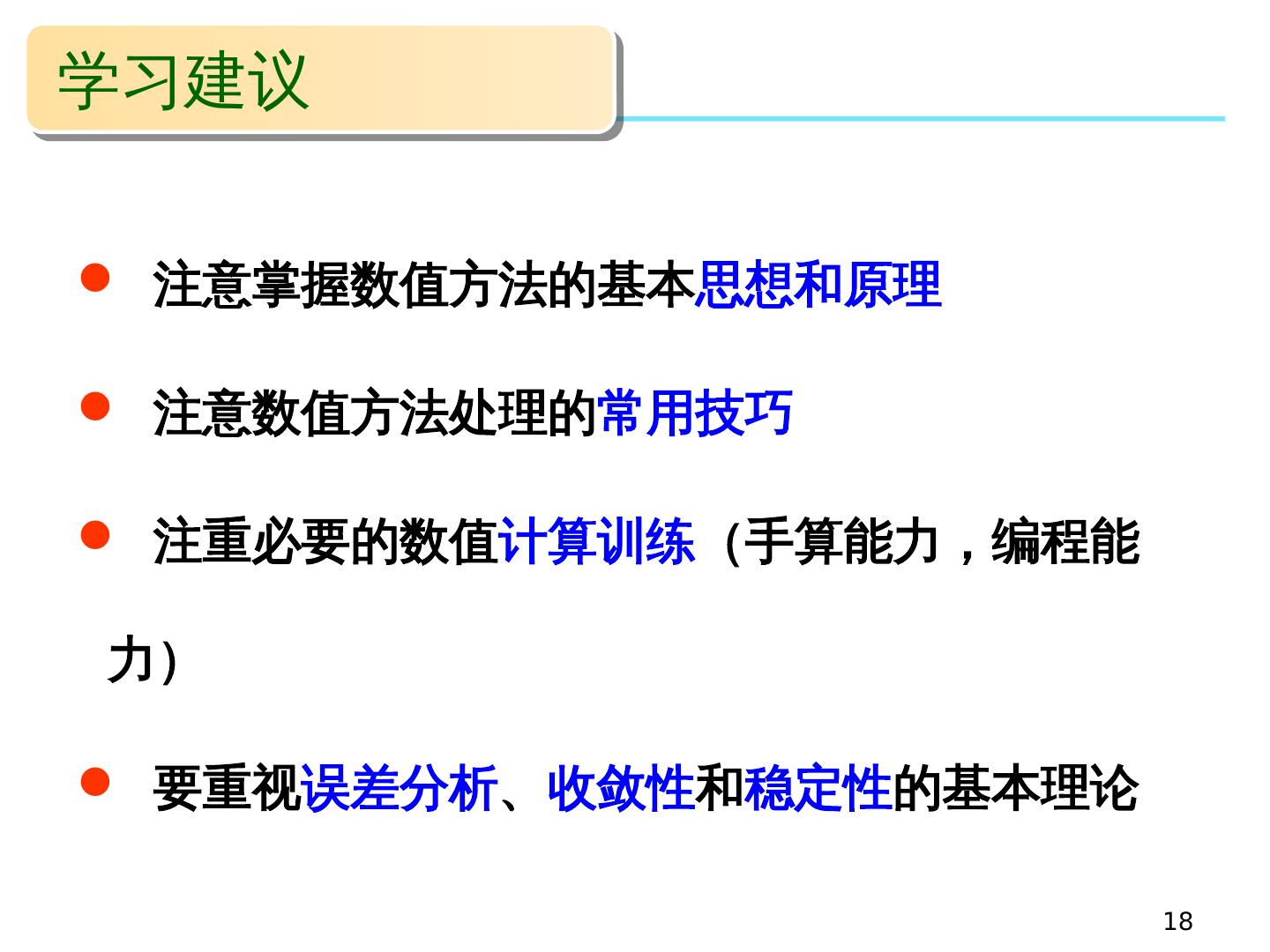18 .学习建议 18 注意掌握数值方法的基本 思想和原理 注意数值方法处理 的 常用技巧 注重必要的数值 计算训练 (手算能力,编程能力) 要重视 误差分析 、 收敛性 和 稳定性 的基本 理论