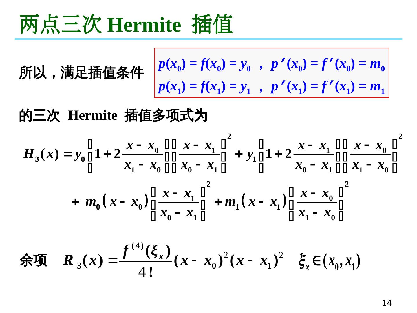 14 .14 两点三次 Hermite 插值 所以,满足插值条件 p ( x 0 ) = f ( x 0 ) = y 0 , p ’ ( x 0 ) = f ’ ( x 0 ) = m 0 p ( x 1 ) = f ( x 1 ) = y 1 , p ’ ( x 1 ) = f ’ ( x 1 ) = m 1 的 三次 Hermite 插值多项式为 余项