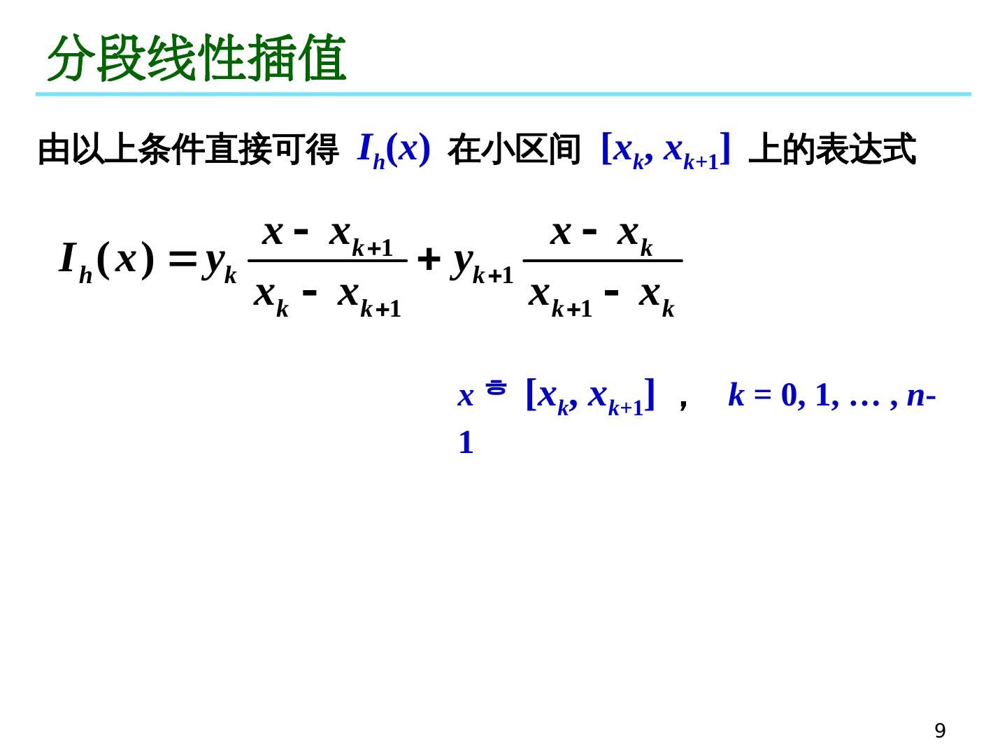 9 .9 分段 线性插值 由以上条件直接可得 I h ( x ) 在小区间 [ x k , x k+ 1 ] 上的表达式 x [ x k , x k+ 1 ] , k = 0, 1, … , n -1