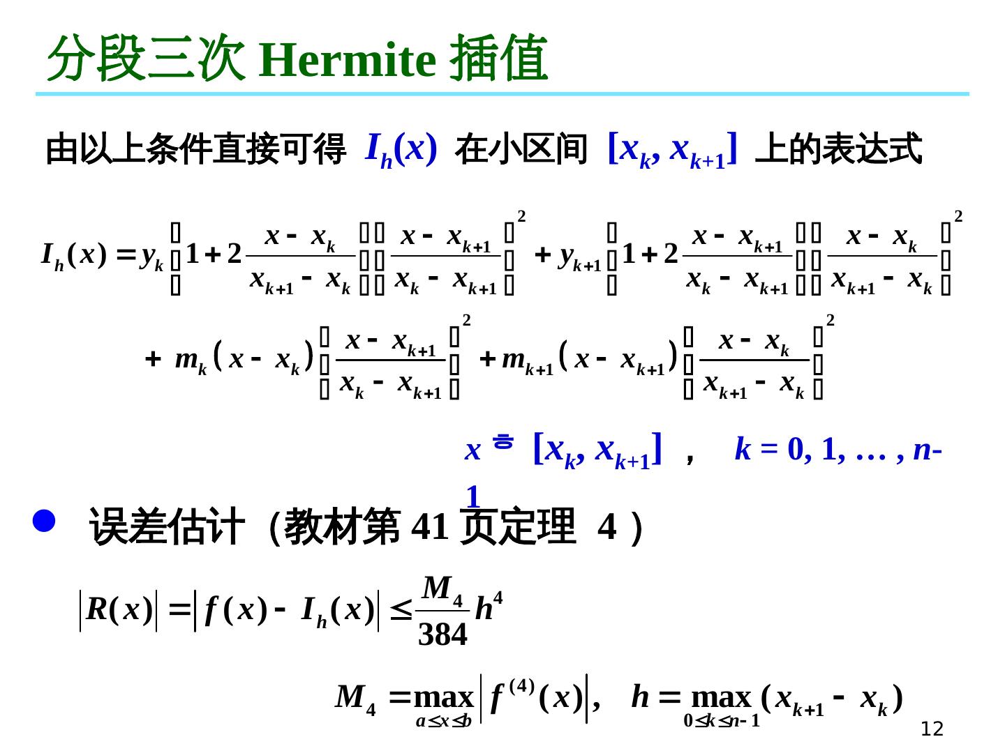 12 .12 分段 三次 Hermite 插值 由以上条件直接可得 I h ( x ) 在小区间 [ x k , x k+ 1 ] 上的表达式 x [ x k , x k+ 1 ] , k = 0, 1, … , n -1 误差估计(教材第 41 页定理 4 )