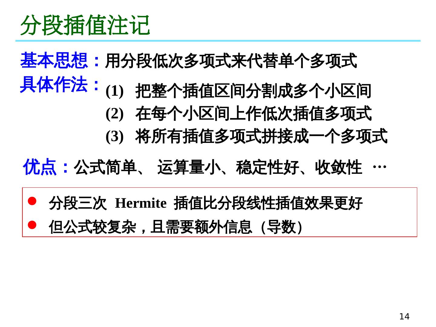 14 .14 分段插值注记 分段三次 Hermite 插值比分段线性插值效果更好 但公式较复杂,且需要额外信息(导数) 基本思想: 用分段低次多项式来代替单个多项式 具体作法: 优点: 公式简单 、 运算量小 、 稳定性好、收敛性 … (1) 把整个插值区间分割成多个小区间 (2) 在每个小区间上作低次插值多项式 (3) 将所有插值多项式拼接成一个多项式