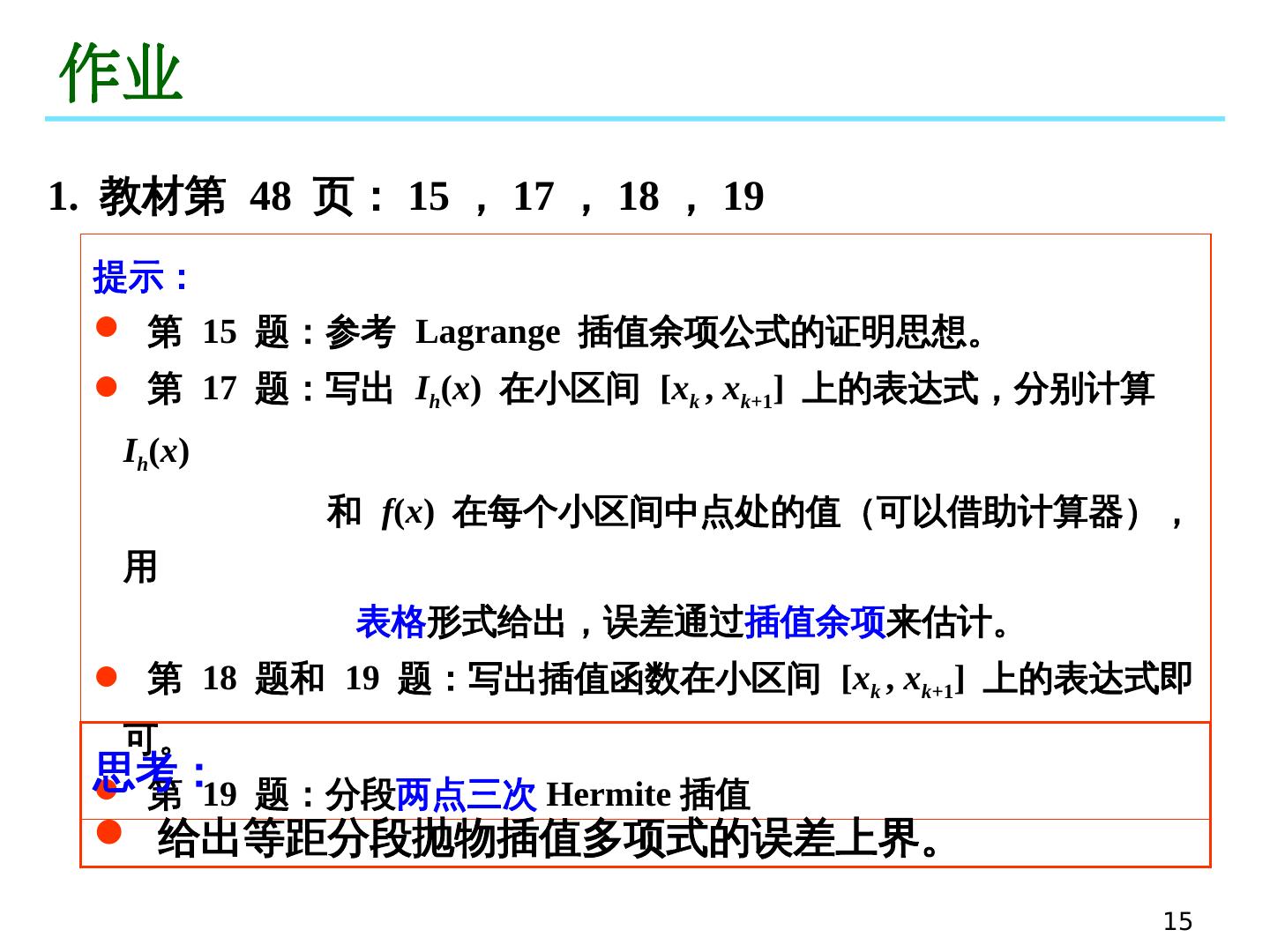 15 .15 作业 1. 教材第 48 页: 15 , 17 , 18 , 19 提示: 第 15 题:参考 Lagrange 插值余项公式的证明 思想。 第 17 题:写出 I h ( x ) 在小区间 [ x k , x k +1 ] 上的 表达式,分别计算 I h ( x ) 和 f ( x ) 在每个小区间中点处的值(可以借助计算器),用 表格 形式给出,误差通过 插值余项 来估计。 第 18 题和 19 题: 写出插值函数在小区间 [ x k , x k +1 ] 上的表达式即 可。 第 19 题:分段 两点三次 Hermite 插值 思考: 给出等距分段抛物插值多项式的误差上界 。