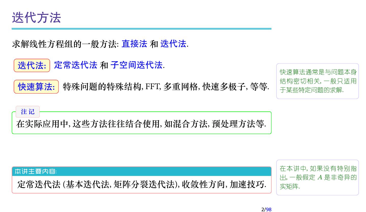 1 .第三讲 基本迭代方法 • 定常迭代法 • 收敛性分析 • 正则分裂 • 交替方向迭代法 • 加速技巧