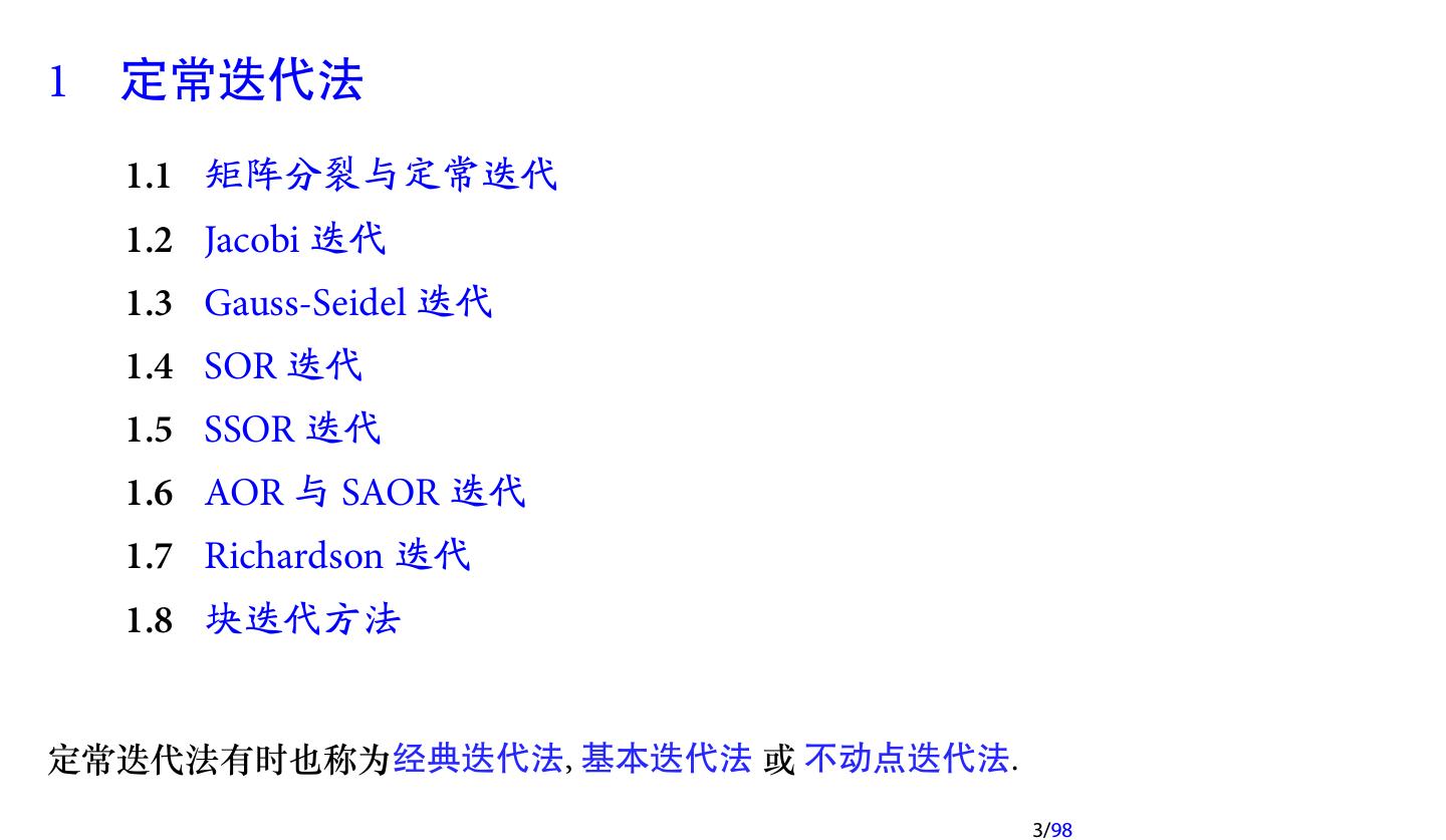 3 .1 定常迭代法 1.1 矩阵分裂与定常迭代 1.2 Jacobi 迭代 1.3 Gauss-Seidel 迭代 1.4 SOR 迭代 1.5 SSOR 迭代 1.6 AOR 与 SAOR 迭代 1.7 Richardson 迭代 1.8 块迭代方法 定常迭代法有时也称为经典迭代法, 基本迭代法 或 不动点迭代法. 3/98