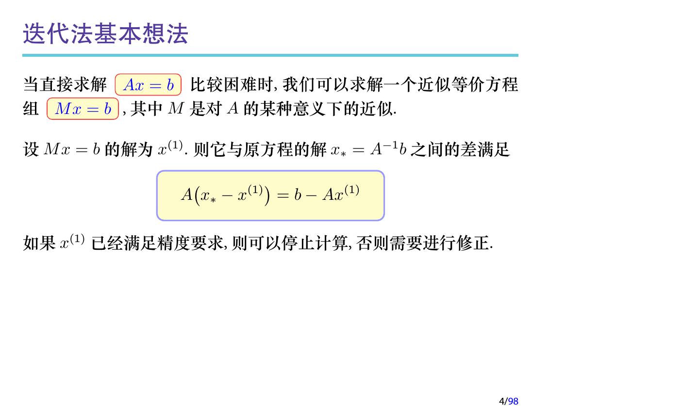 4 .迭代法基本想法 当直接求解 Ax = b 比较困难时, 我们可以求解一个近似等价方程 组 M x = b , 其中 M 是对 A 的某种意义下的近似. 设 M x = b 的解为 x(1) . 则它与原方程的解 x∗ = A−1 b 之间的差满足 ( ) A x∗ − x(1) = b − Ax(1) 如果 x(1) 已经满足精度要求, 则可以停止计算, 否则需要进行修正. 4/98