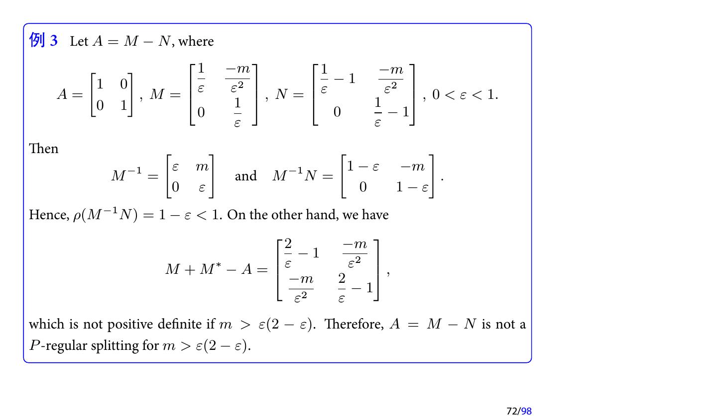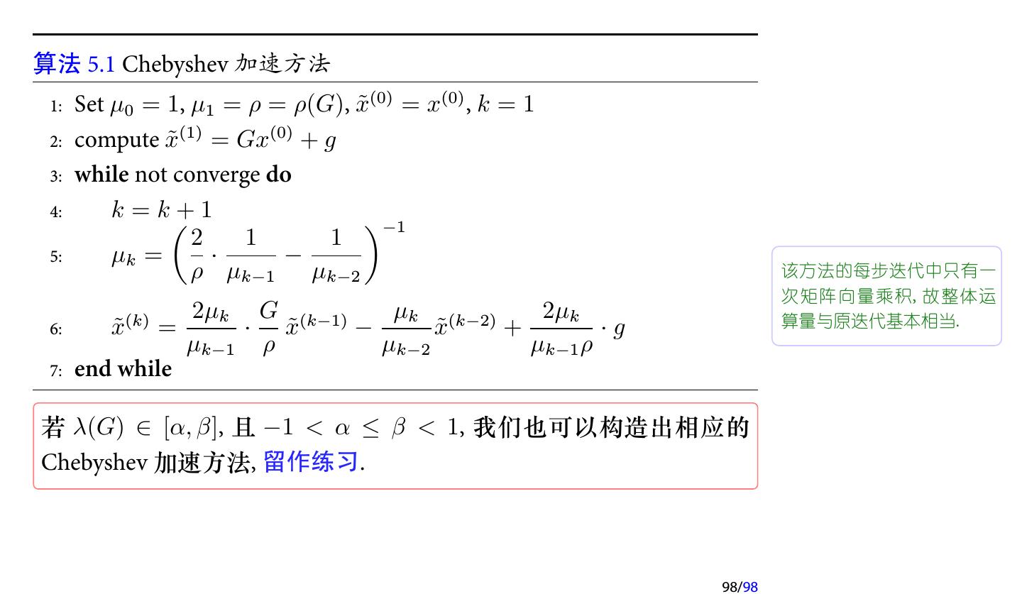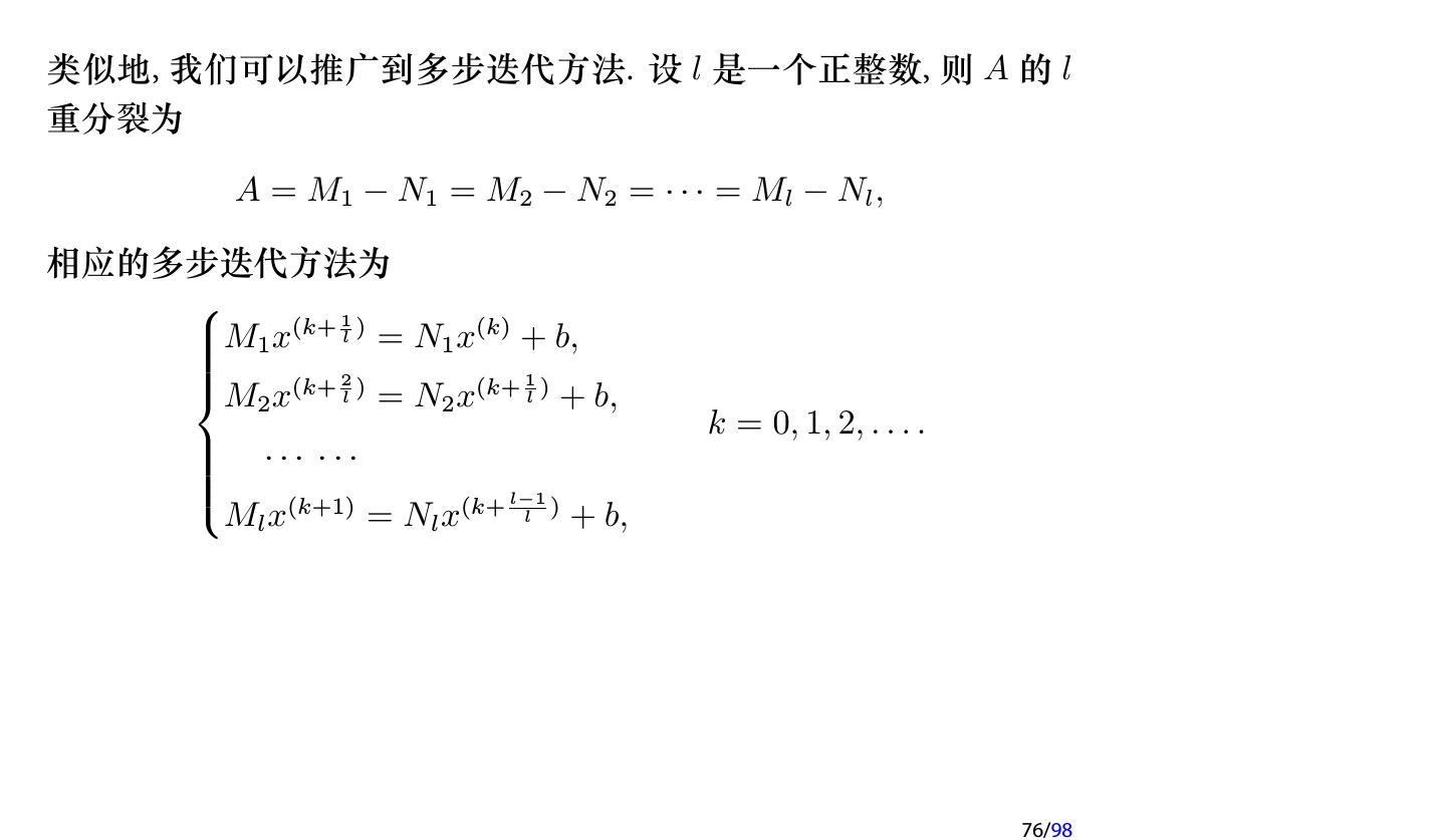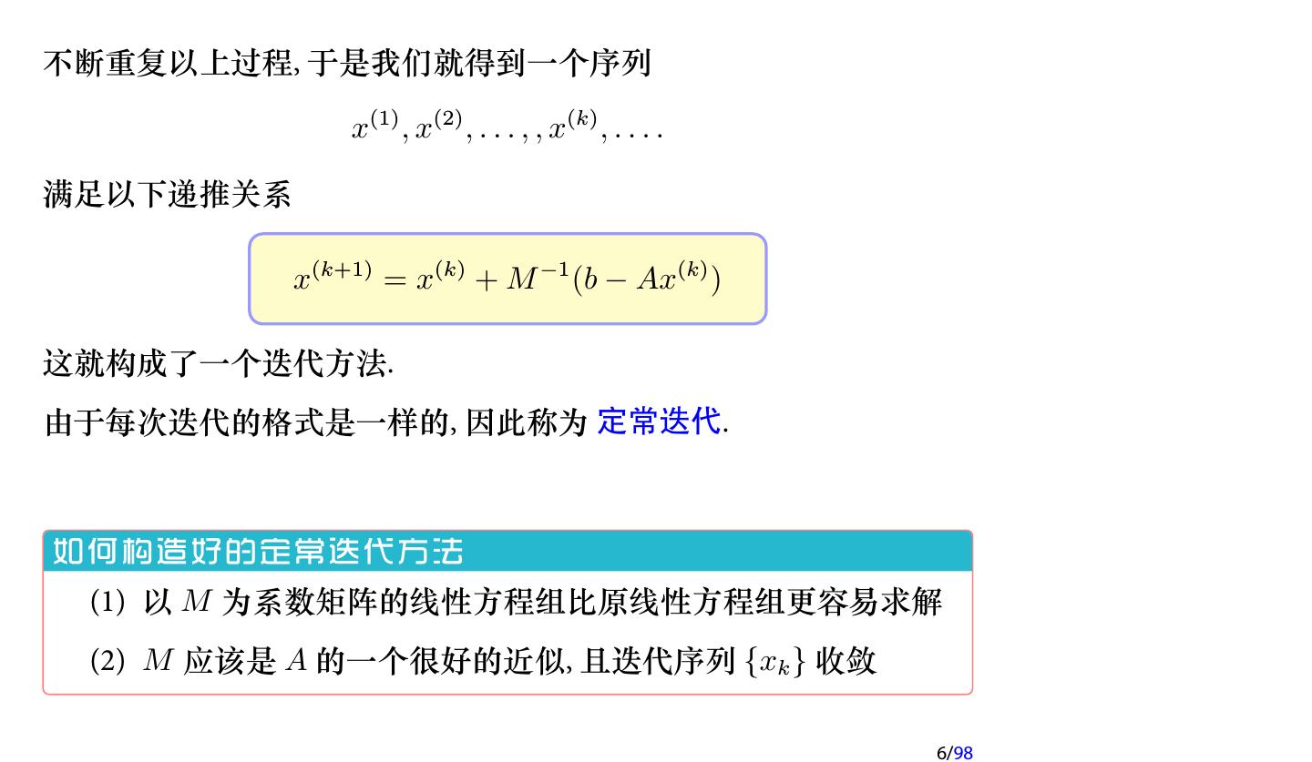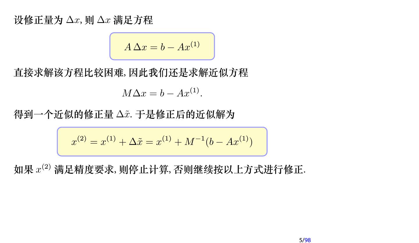 5 .设修正量为 ∆x, 则 ∆x 满足方程 A ∆x = b − Ax(1) 直接求解该方程比较困难, 因此我们还是求解近似方程 M ∆x = b − Ax(1) . 得到一个近似的修正量 ∆˜ x. 于是修正后的近似解为 x = x(1) + M −1 (b − Ax(1) ) x(2) = x(1) + ∆˜ 如果 x(2) 满足精度要求, 则停止计算, 否则继续按以上方式进行修正. 5/98