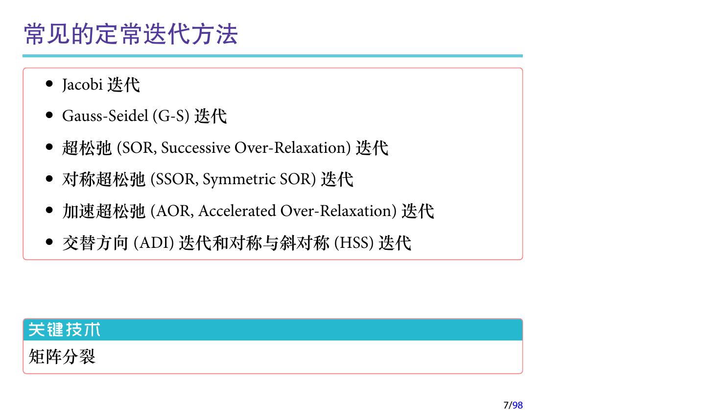 7 .常见的定常迭代方法 • Jacobi 迭代 • Gauss-Seidel (G-S) 迭代 • 超松弛 (SOR, Successive Over-Relaxation) 迭代 • 对称超松弛 (SSOR, Symmetric SOR) 迭代 • 加速超松弛 (AOR, Accelerated Over-Relaxation) 迭代 • 交替方向 (ADI) 迭代和对称与斜对称 (HSS) 迭代 关键技术 矩阵分裂 7/98