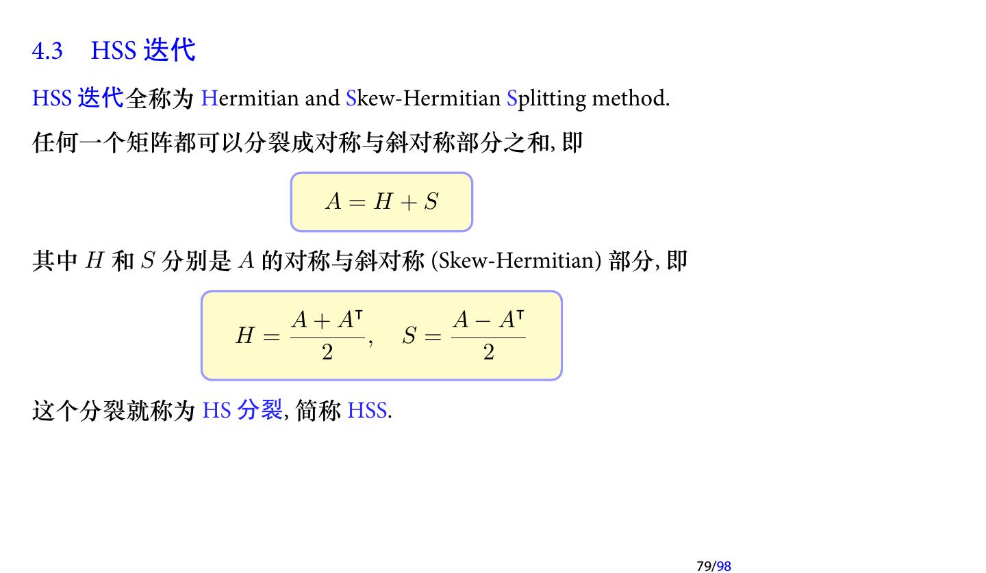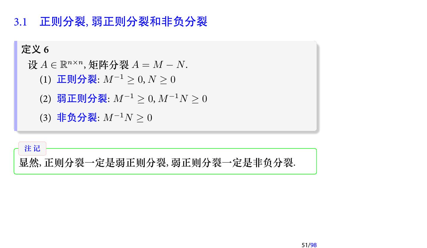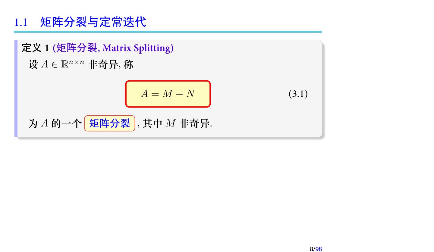 8 .1.1 矩阵分裂与定常迭代 定义 1 (矩阵分裂, Matrix Splitting) 设 A ∈ Rn×n 非奇异, 称 A=M −N (3.1) 为 A 的一个 矩阵分裂 , 其中 M 非奇异. 8/98