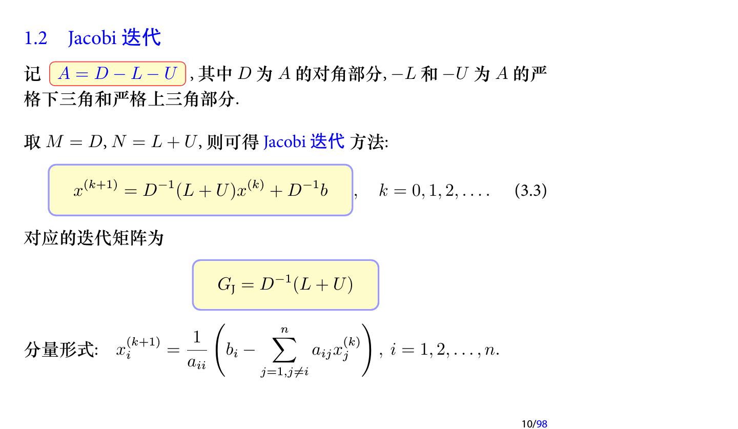 9 .给定一个矩阵分裂 (3.1), 则原方程组 Ax = b 就等价于 M x = N x + b . 于是我们就可以构造出以下的迭代格式 M x(k+1) = N x(k) + b , k = 0, 1, . . . , 或 x(k+1) = M −1 N x(k) + M −1 b ≜ Gx(k) + g , k = 0, 1, . . . , (3.2) 其中 G ≜ M −1 称为 迭代矩阵. N 这就是基于矩阵分裂 A = M − N 的迭代方法. 选取不同的 M , 就可以构造出不同的迭代方法. 9/98