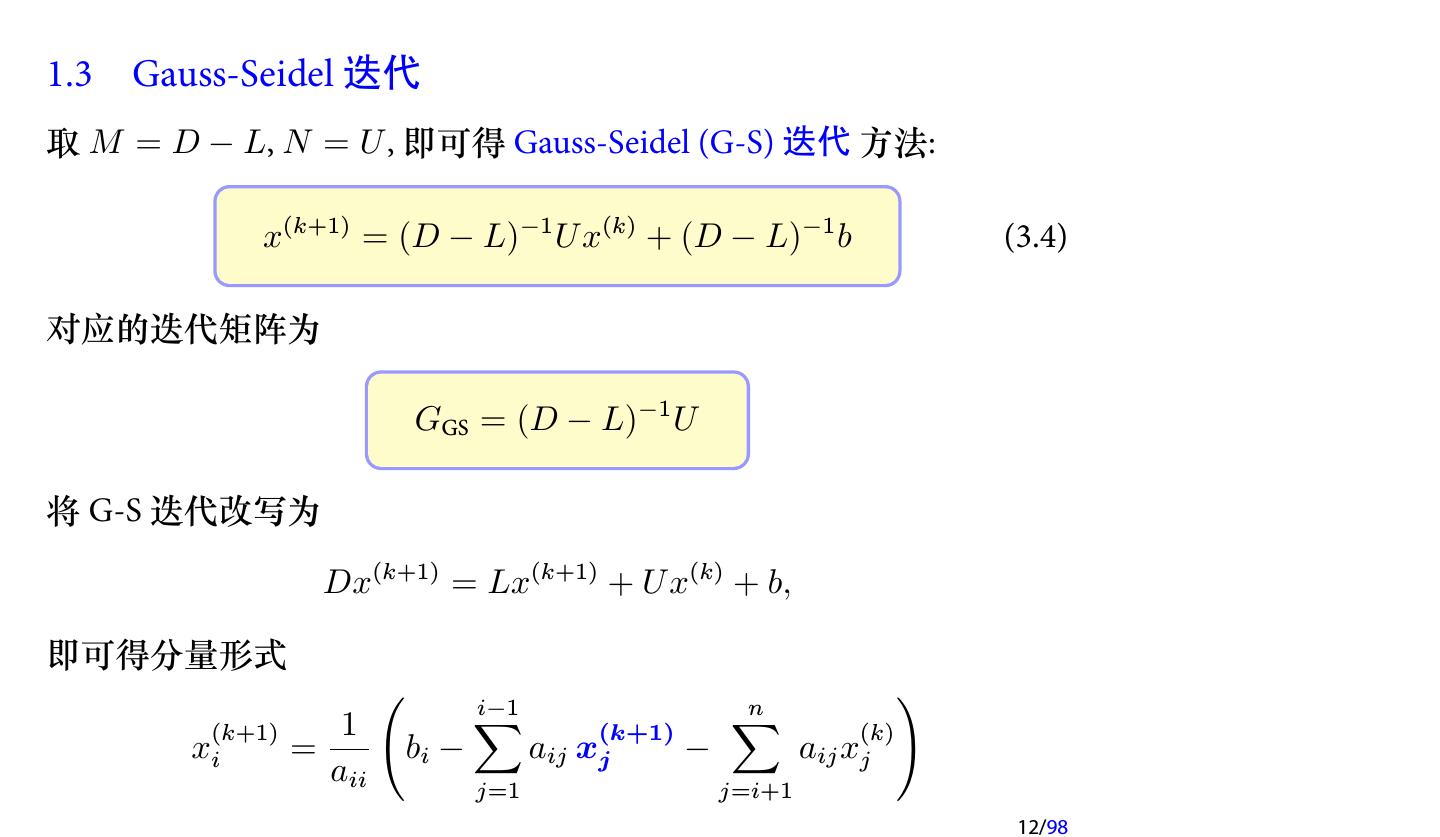 12 .1.3 Gauss-Seidel 迭代 取 M = D − L, N = U , 即可得 Gauss-Seidel (G-S) 迭代 方法: x(k+1) = (D − L)−1 U x(k) + (D − L)−1 b (3.4) 对应的迭代矩阵为 GGS = (D − L)−1 U 将 G-S 迭代改写为 Dx(k+1) = Lx(k+1) + U x(k) + b, 即可得分量形式 ( ) (k+1) 1 ∑ i−1 (k+1) ∑ n (k) xi = bi − aij xj − aij xj aii j=1 j=i+1 12/98