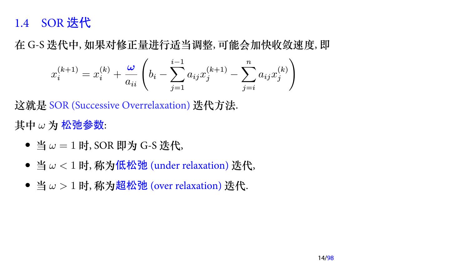 14 .1.4 SOR 迭代 在 G-S 迭代中, 如果对修正量进行适当调整, 可能会加快收敛速度, 即 ( ) (k+1) (k) ω ∑ i−1 (k+1) ∑n (k) xi = xi + bi − aij xj − aij xj aii j=1 j=i 这就是 SOR (Successive Overrelaxation) 迭代方法. 其中 ω 为 松弛参数: • 当 ω = 1 时, SOR 即为 G-S 迭代, • 当 ω < 1 时, 称为低松弛 (under relaxation) 迭代, • 当 ω > 1 时, 称为超松弛 (over relaxation) 迭代. 14/98