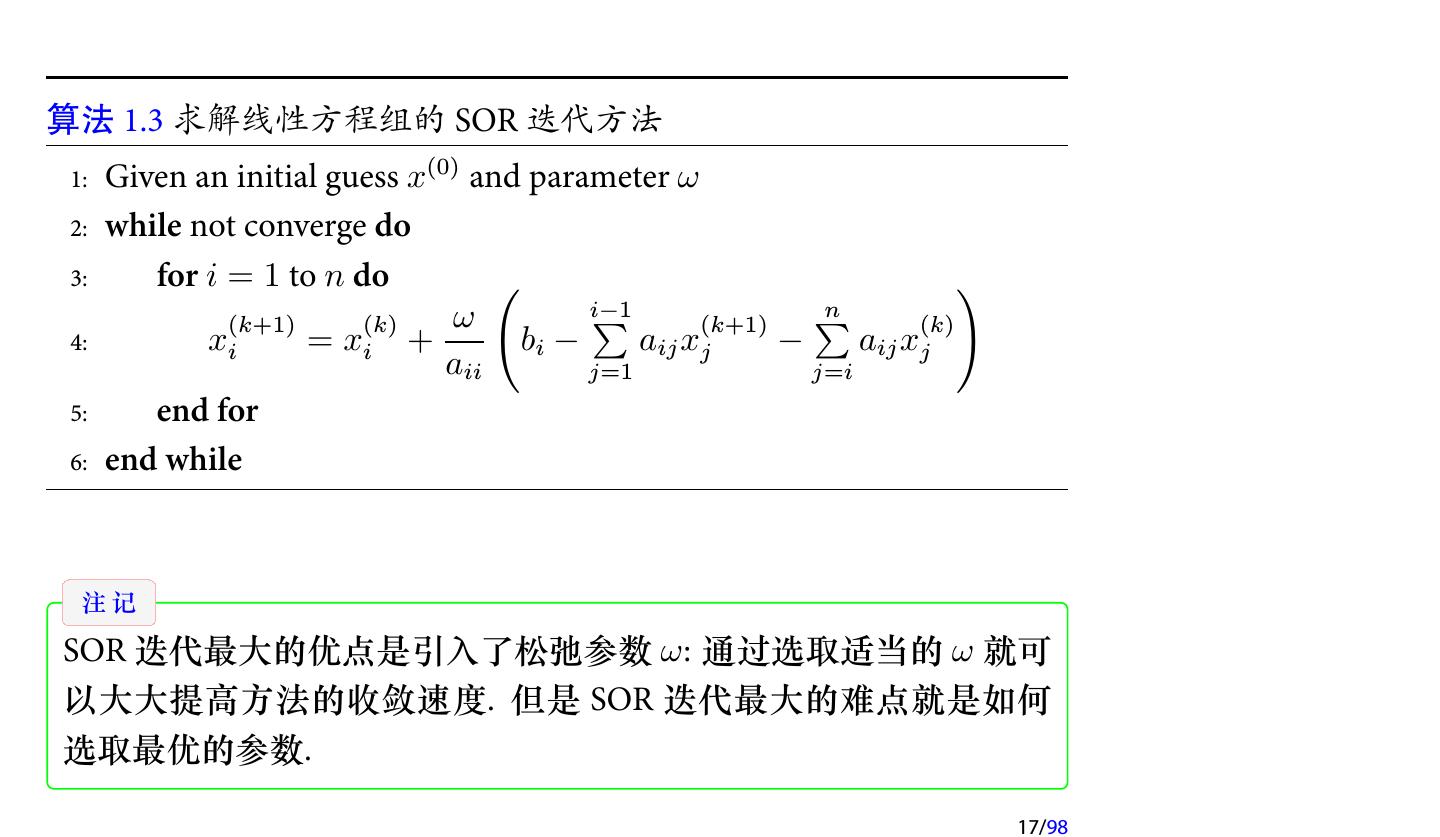 17 .算法 1.3 求解线性方程组的 SOR 迭代方法 1: Given an initial guess x(0) and parameter ω 2: while not converge do 3: for i = 1 to n do ( ) (k+1) (k) ω ∑ i−1 (k+1) ∑n (k) 4: xi = xi + bi − aij xj − aij xj aii j=1 j=i 5: end for 6: end while 注记 SOR 迭代最大的优点是引入了松弛参数 ω: 通过选取适当的 ω 就可 以大大提高方法的收敛速度. 但是 SOR 迭代最大的难点就是如何 选取最优的参数. 17/98