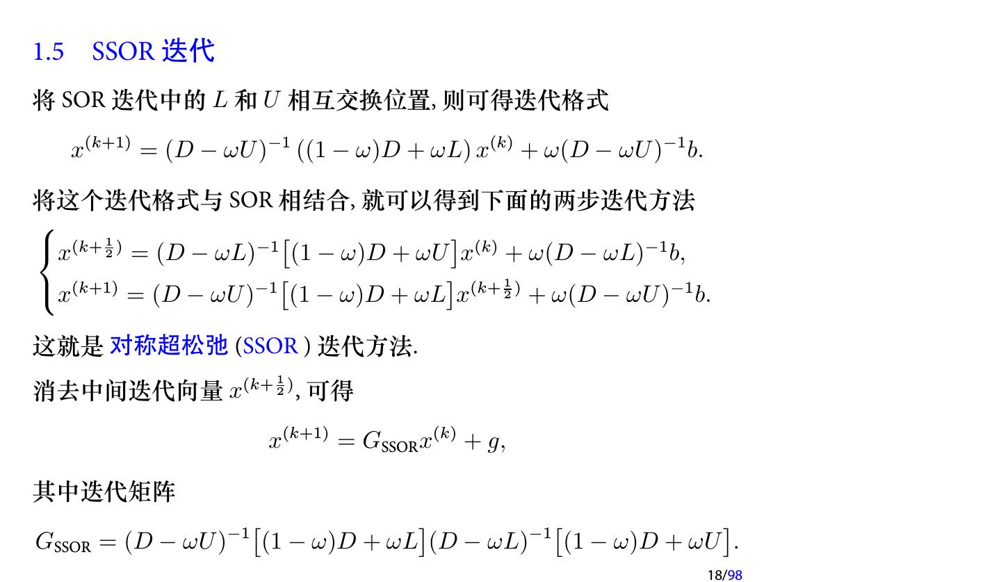 18 .1.5 SSOR 迭代 将 SOR 迭代中的 L 和 U 相互交换位置, 则可得迭代格式 x(k+1) = (D − ωU )−1 ((1 − ω)D + ωL) x(k) + ω(D − ωU )−1 b. 将这个迭代格式与 SOR 相结合, 就可以得到下面的两步迭代方法 x(k+ 12 ) = (D − ωL)−1 [(1 − ω)D + ωU ]x(k) + ω(D − ωL)−1 b, [ ] x(k+1) = (D − ωU )−1 (1 − ω)D + ωL x(k+ 12 ) + ω(D − ωU )−1 b. 这就是 对称超松弛 (SSOR ) 迭代方法. 1 消去中间迭代向量 x(k+ 2 ) , 可得 x(k+1) = GSSOR x(k) + g, 其中迭代矩阵 [ ] [ ] GSSOR = (D − ωU )−1 (1 − ω)D + ωL (D − ωL)−1 (1 − ω)D + ωU . 18/98