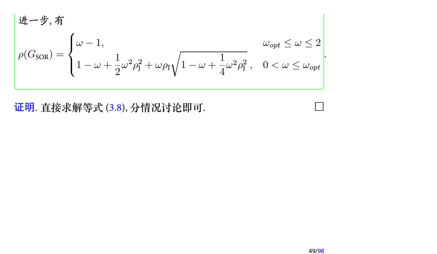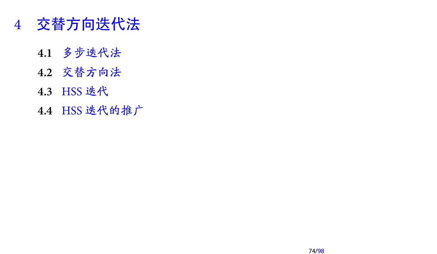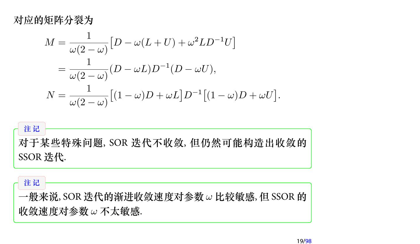19 .对应的矩阵分裂为 1 [ ] M= D − ω(L + U ) + ω 2 LD−1 U ω(2 − ω) 1 = (D − ωL)D−1 (D − ωU ), ω(2 − ω) 1 [ ] [ ] N= (1 − ω)D + ωL D−1 (1 − ω)D + ωU . ω(2 − ω) 注记 对于某些特殊问题, SOR 迭代不收敛, 但仍然可能构造出收敛的 SSOR 迭代. 注记 一般来说, SOR 迭代的渐进收敛速度对参数 ω 比较敏感, 但 SSOR 的 收敛速度对参数 ω 不太敏感. 19/98