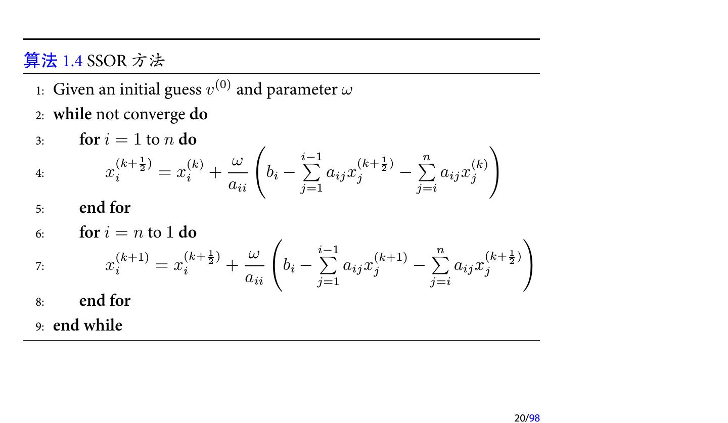 20 .算法 1.4 SSOR 方法 1: Given an initial guess v (0) and parameter ω 2: while not converge do 3: for i = 1 to n do ( ) (k+ 12 ) (k) ω ∑ i−1 (k+ 21 ) ∑n (k) 4: xi = xi + bi − aij xj − aij xj aii j=1 j=i 5: end for 6: for i = n to 1 do ( ) (k+1) (k+ 12 ) ω ∑ i−1 (k+1) ∑ n (k+ 12 ) 7: xi = xi + bi − aij xj − aij xj aii j=1 j=i 8: end for 9: end while 20/98