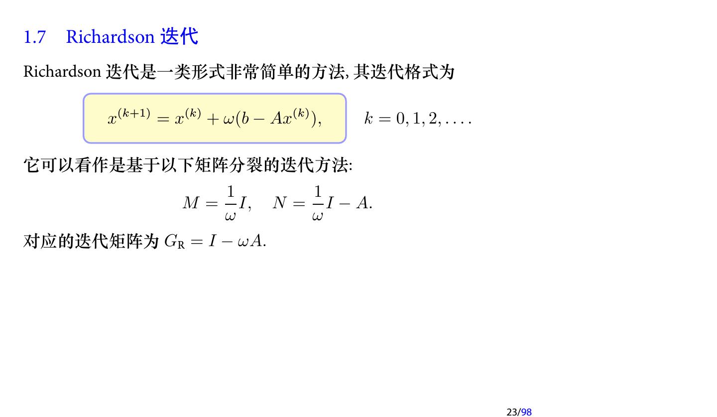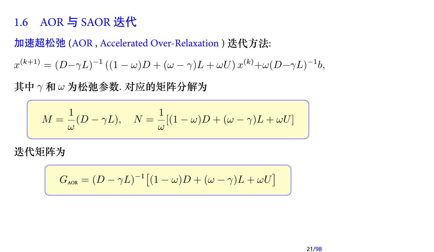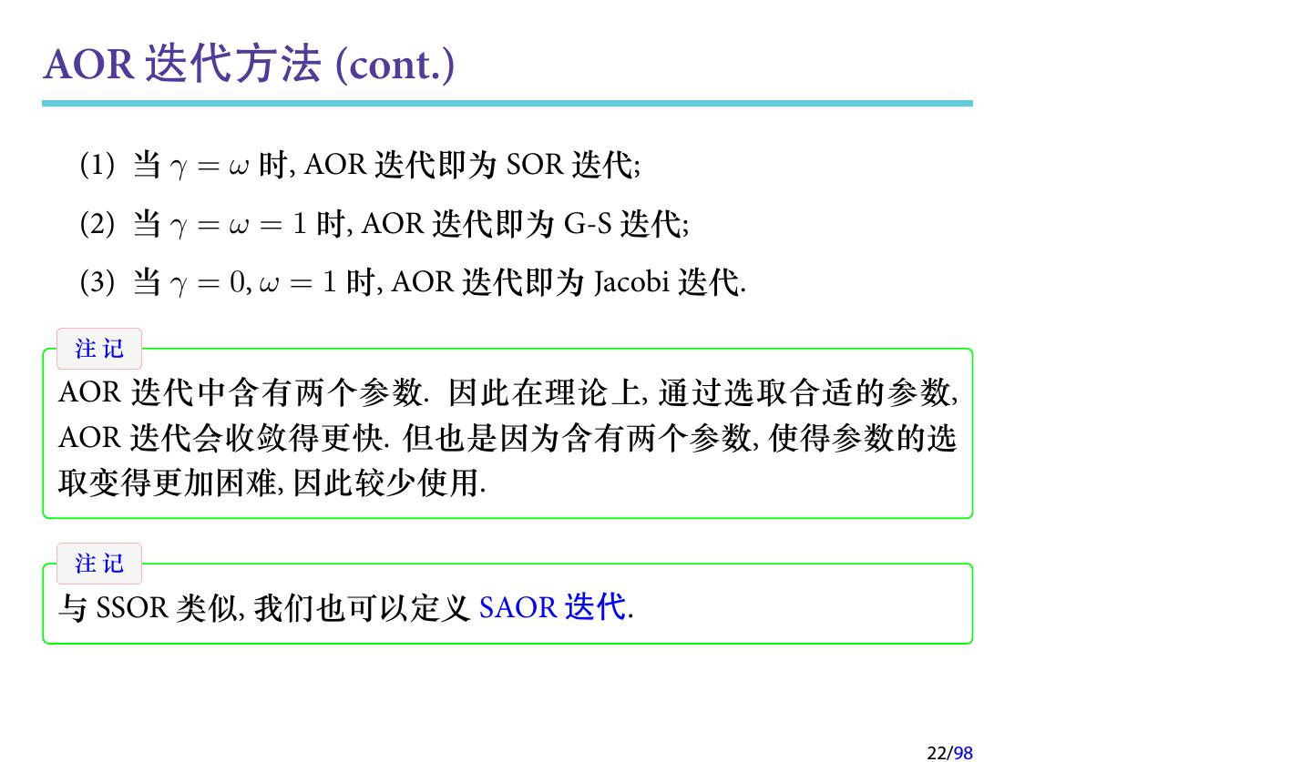 22 .AOR 迭代方法 (cont.) (1) 当 γ = ω 时, AOR 迭代即为 SOR 迭代; (2) 当 γ = ω = 1 时, AOR 迭代即为 G-S 迭代; (3) 当 γ = 0, ω = 1 时, AOR 迭代即为 Jacobi 迭代. 注记 AOR 迭代中含有两个参数. 因此在理论上, 通过选取合适的参数, AOR 迭代会收敛得更快. 但也是因为含有两个参数, 使得参数的选 取变得更加困难, 因此较少使用. 注记 与 SSOR 类似, 我们也可以定义 SAOR 迭代. 22/98