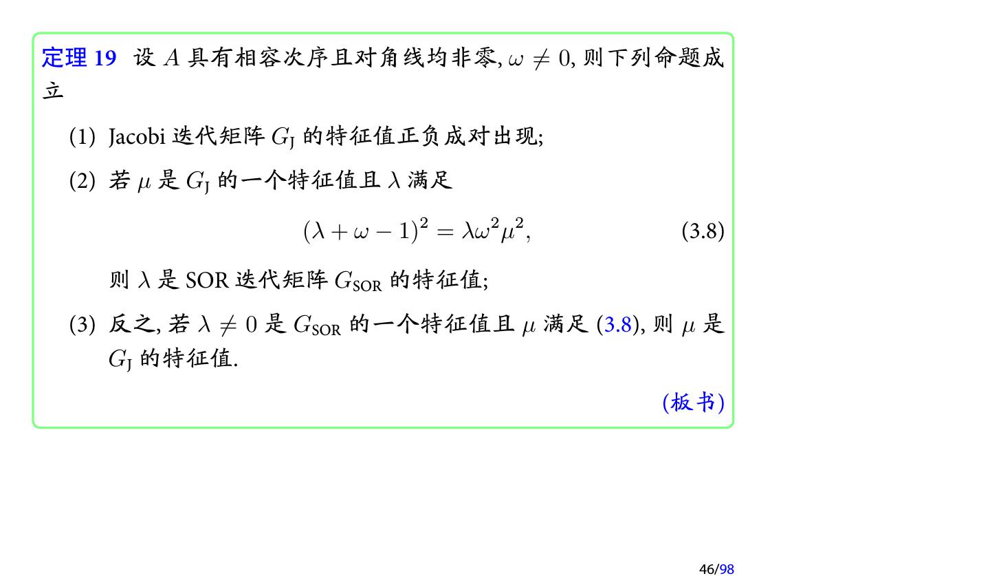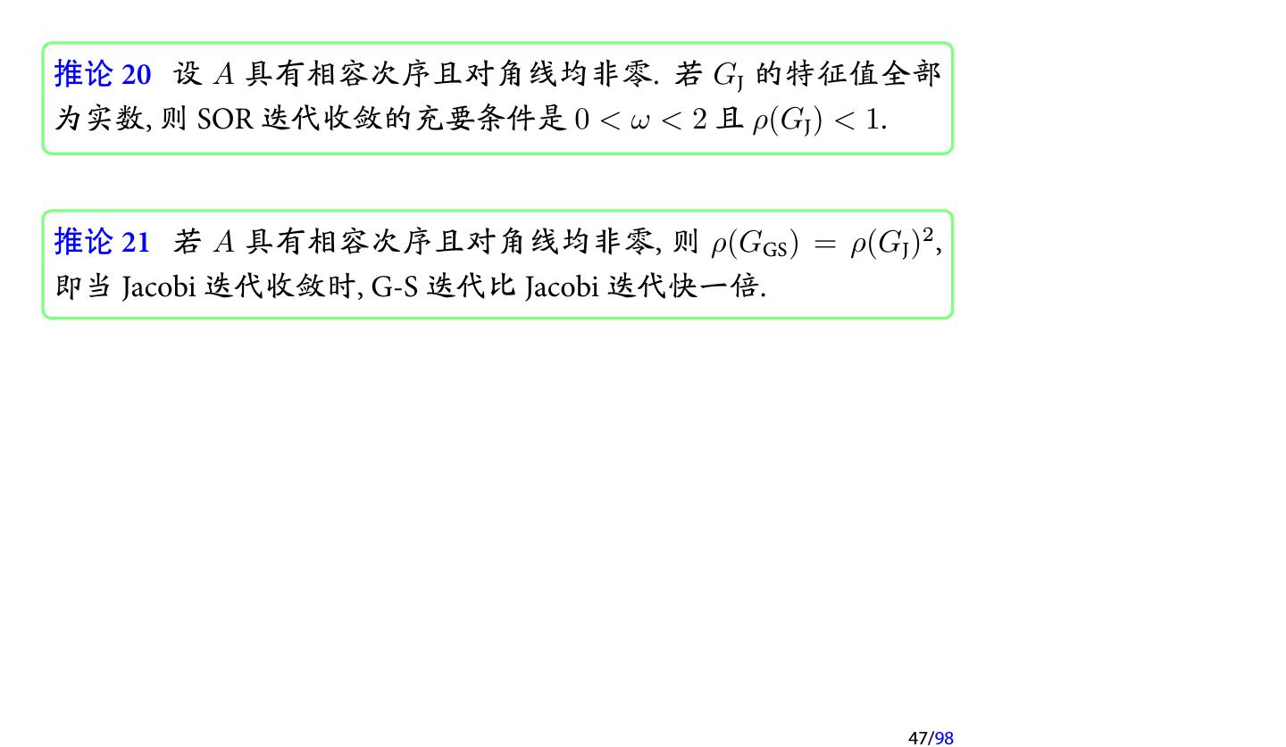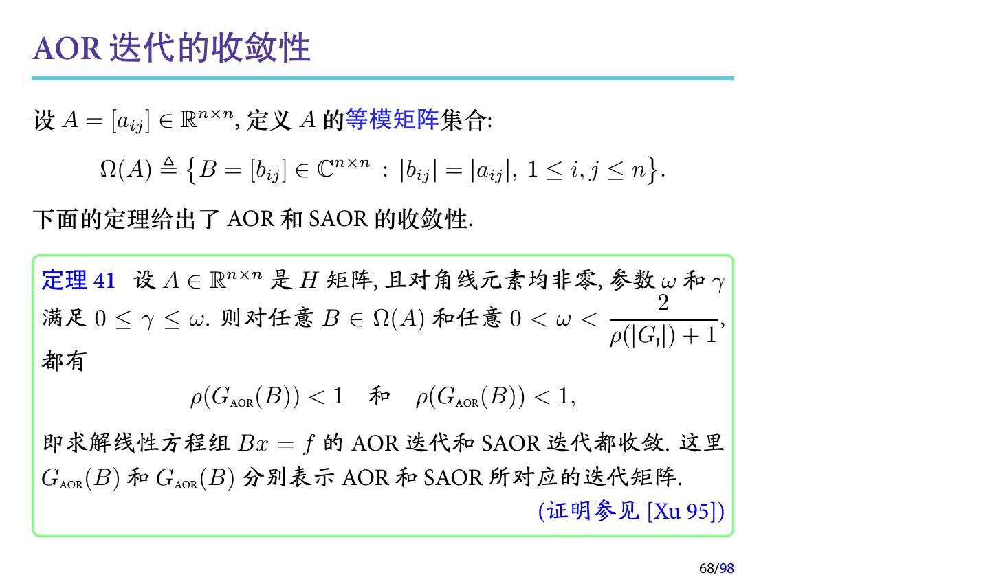 22 .AOR 迭代方法 (cont.) (1) 当 γ = ω 时, AOR 迭代即为 SOR 迭代; (2) 当 γ = ω = 1 时, AOR 迭代即为 G-S 迭代; (3) 当 γ = 0, ω = 1 时, AOR 迭代即为 Jacobi 迭代. 注记 AOR 迭代中含有两个参数. 因此在理论上, 通过选取合适的参数, AOR 迭代会收敛得更快. 但也是因为含有两个参数, 使得参数的选 取变得更加困难, 因此较少使用. 注记 与 SSOR 类似, 我们也可以定义 SAOR 迭代. 22/98