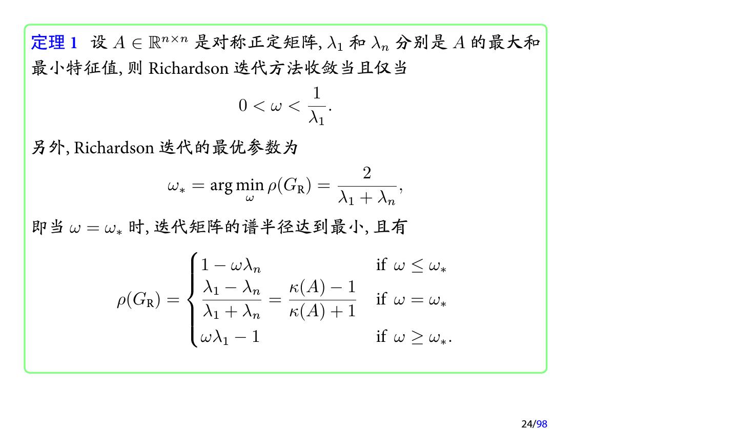 24 .定理 1 设 A ∈ Rn×n 是对称正定矩阵, λ1 和 λn 分别是 A 的最大和 最小特征值, 则 Richardson 迭代方法收敛当且仅当 1 0<ω< . λ1 另外, Richardson 迭代的最优参数为 2 ω∗ = arg min ρ(GR ) = , ω λ1 + λn 即当 ω = ω∗ 时, 迭代矩阵的谱半径达到最小, 且有 1 − ωλn if ω ≤ ω∗ λ − λ 1 n κ(A) − 1 ρ(GR ) = = if ω = ω∗ λ1 + λn κ(A) + 1 ωλ1 − 1 if ω ≥ ω∗ . 24/98
