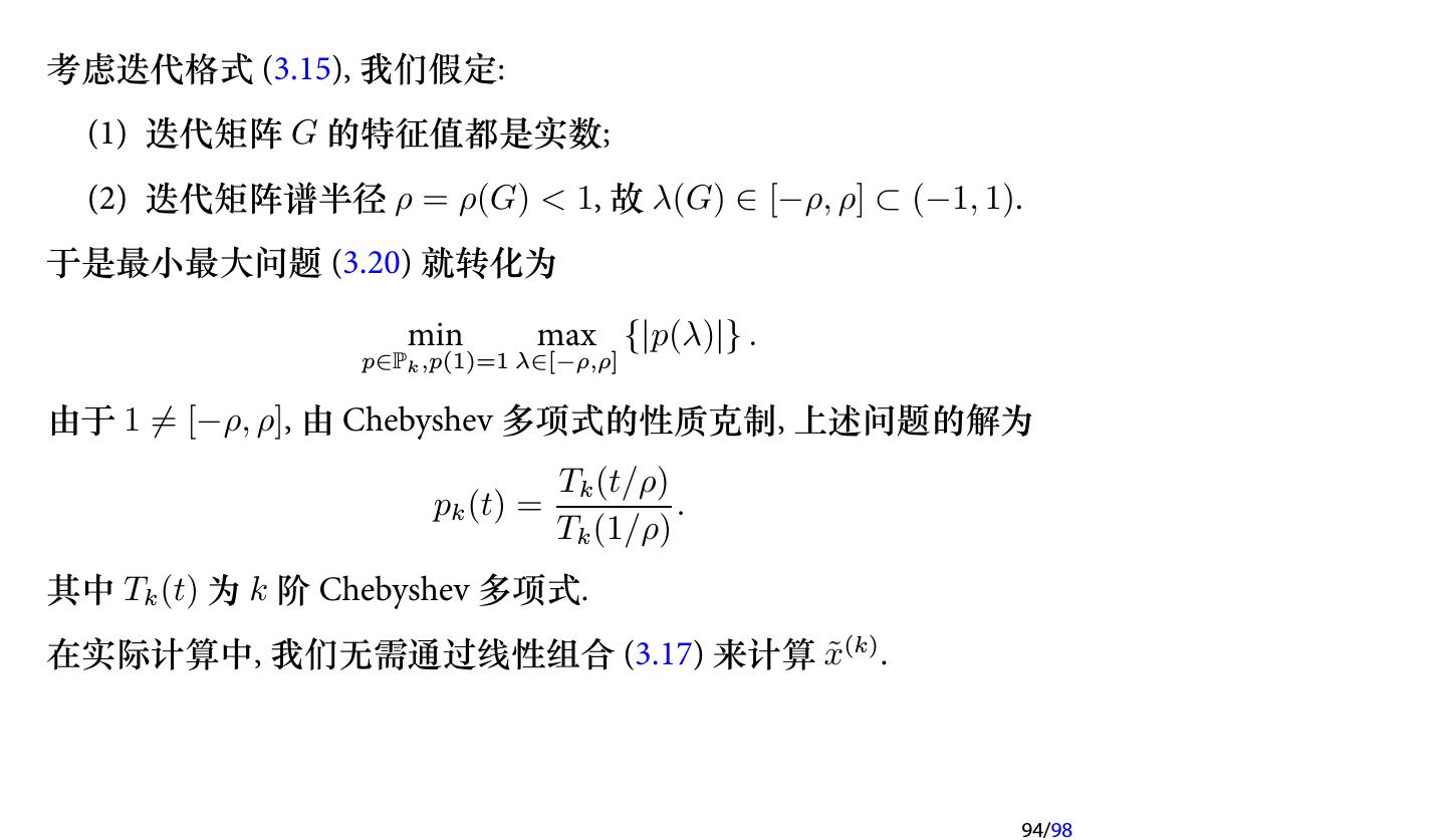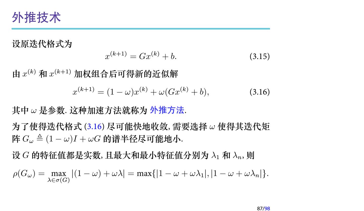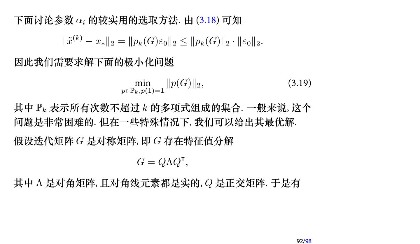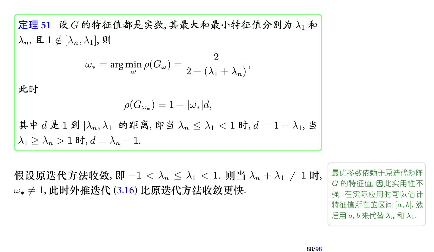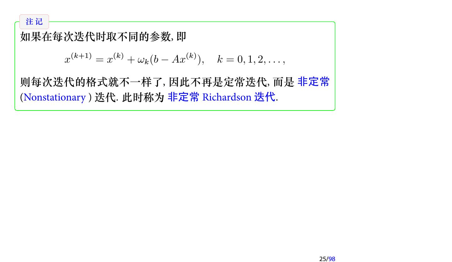 25 .注记 如果在每次迭代时取不同的参数, 即 x(k+1) = x(k) + ωk (b − Ax(k) ), k = 0, 1, 2, . . . , 则每次迭代的格式就不一样了, 因此不再是定常迭代, 而是 非定常 (Nonstationary ) 迭代. 此时称为 非定常 Richardson 迭代. 25/98
