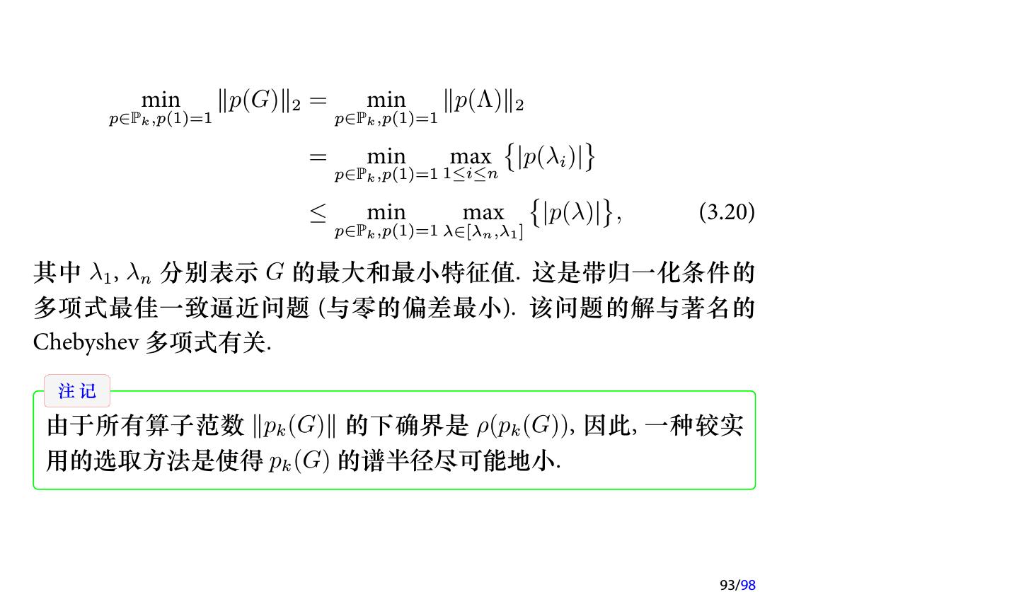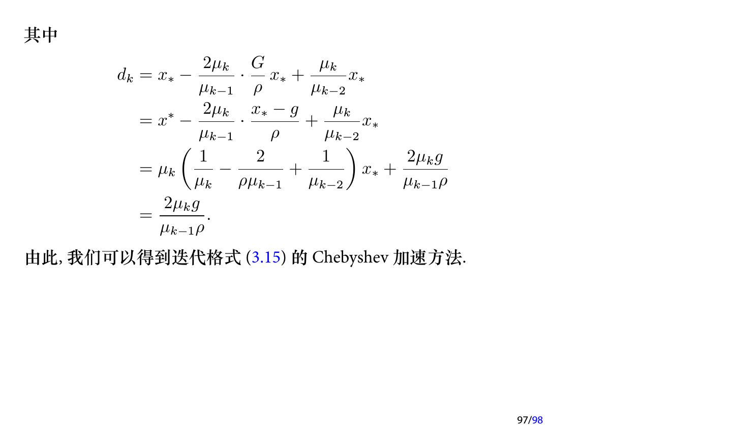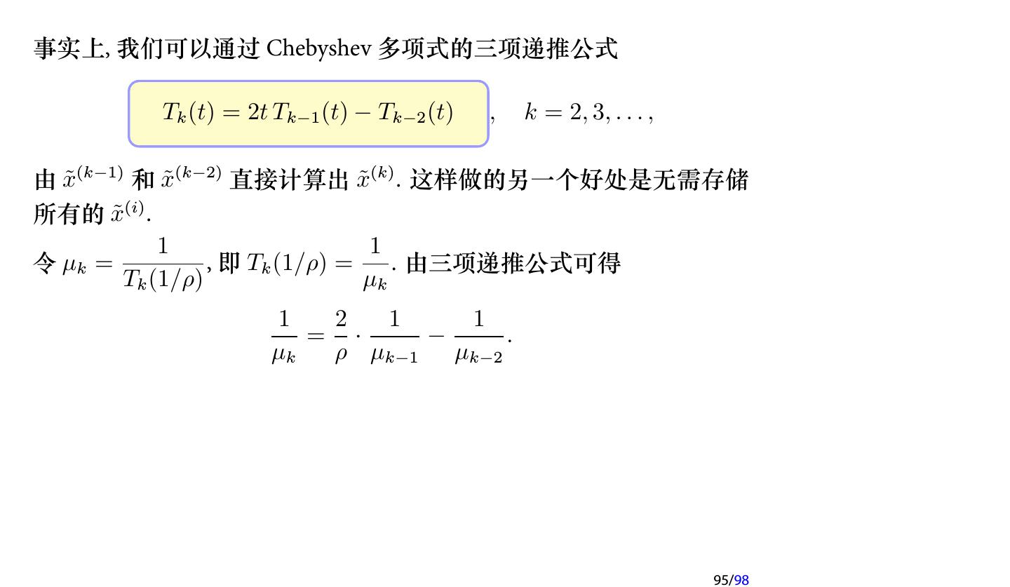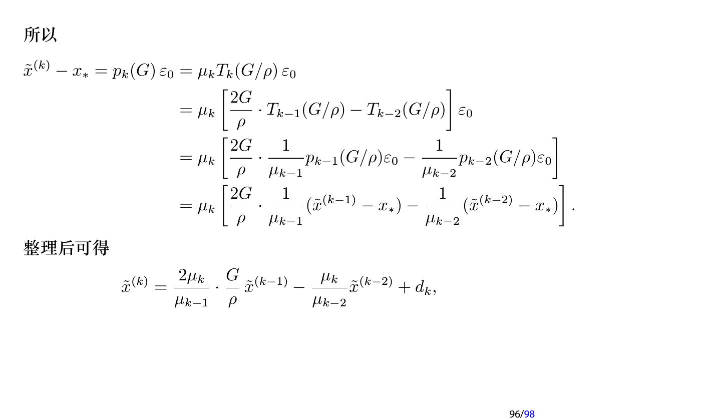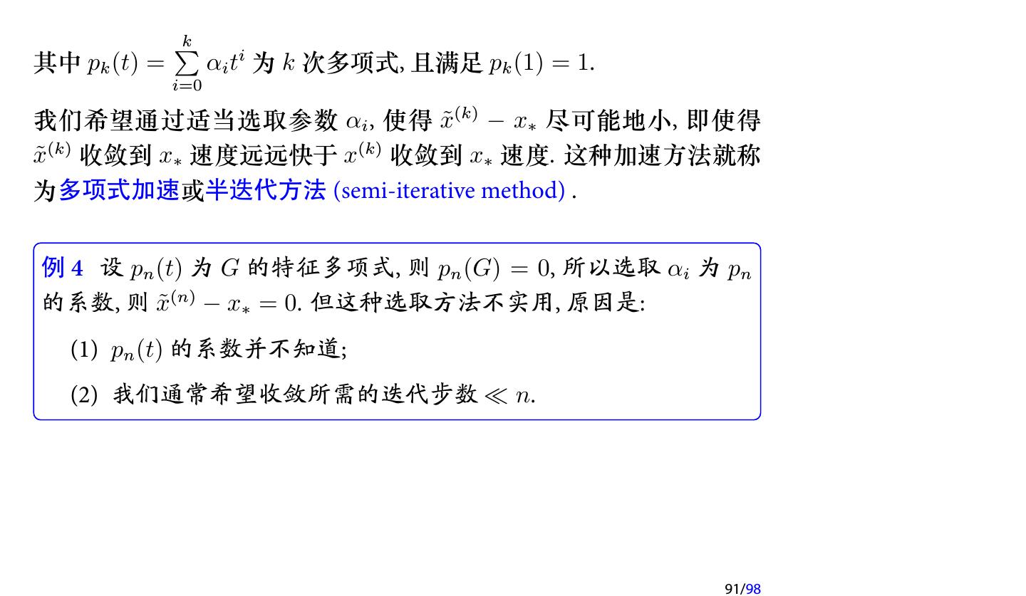 25 .注记 如果在每次迭代时取不同的参数, 即 x(k+1) = x(k) + ωk (b − Ax(k) ), k = 0, 1, 2, . . . , 则每次迭代的格式就不一样了, 因此不再是定常迭代, 而是 非定常 (Nonstationary ) 迭代. 此时称为 非定常 Richardson 迭代. 25/98