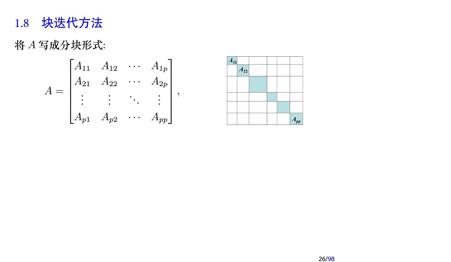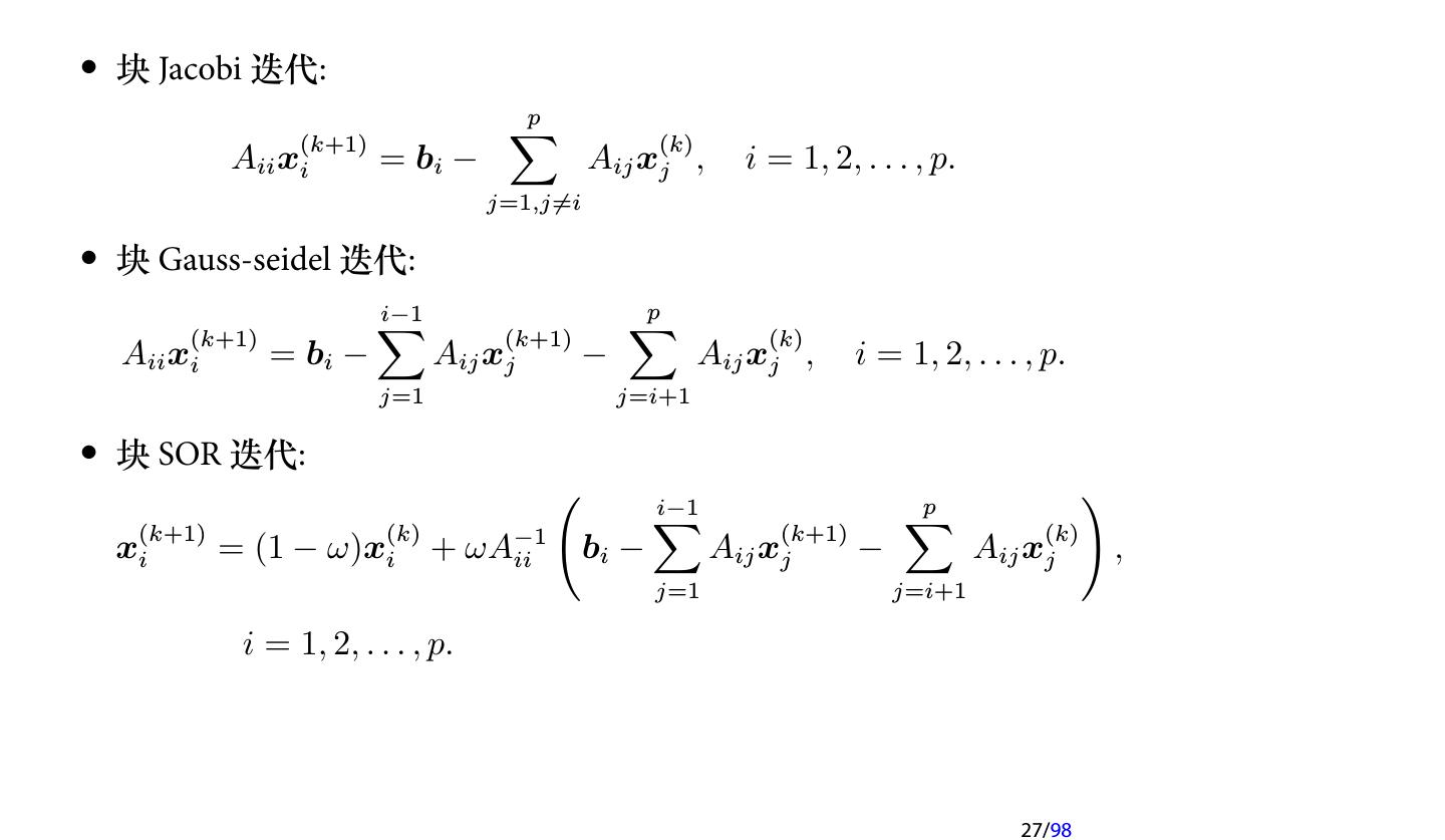 26 .1.8 块迭代方法 将 A 写成分块形式: A11 A12 · · · A1p A21 A22 · · · A2p A= .. .. .. .. , . . . . Ap1 Ap2 · · · App 26/98