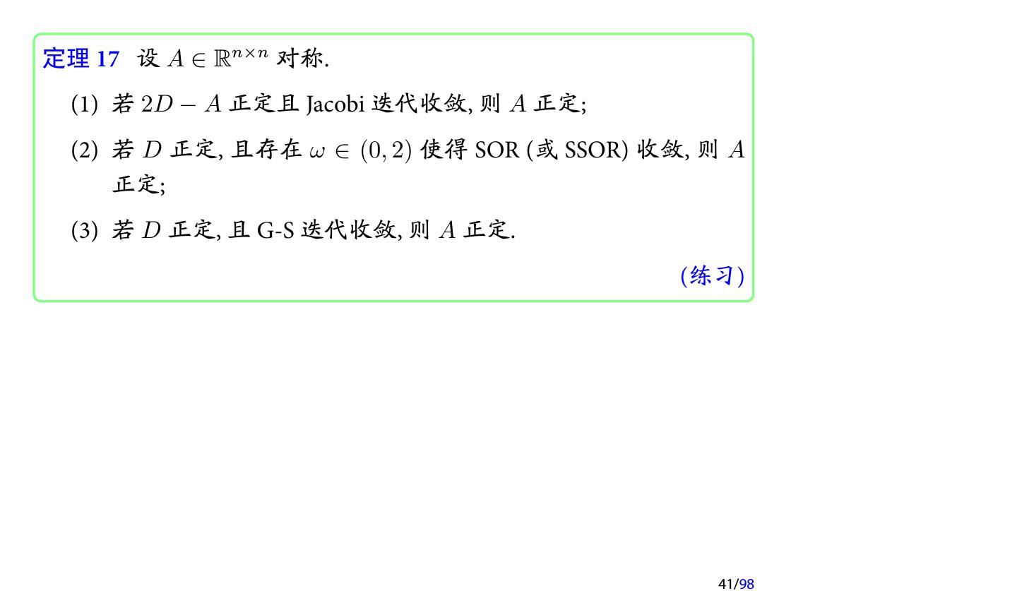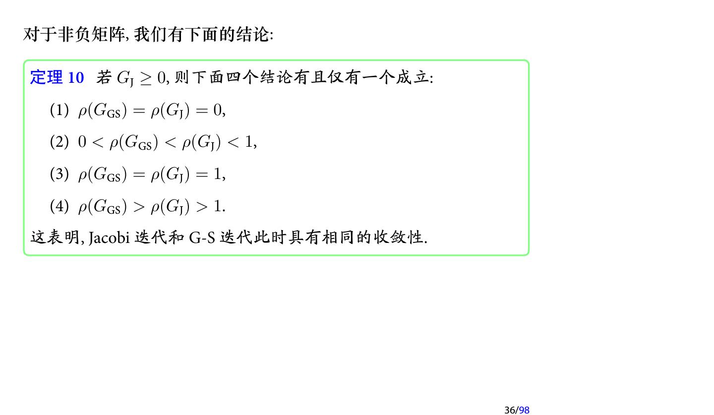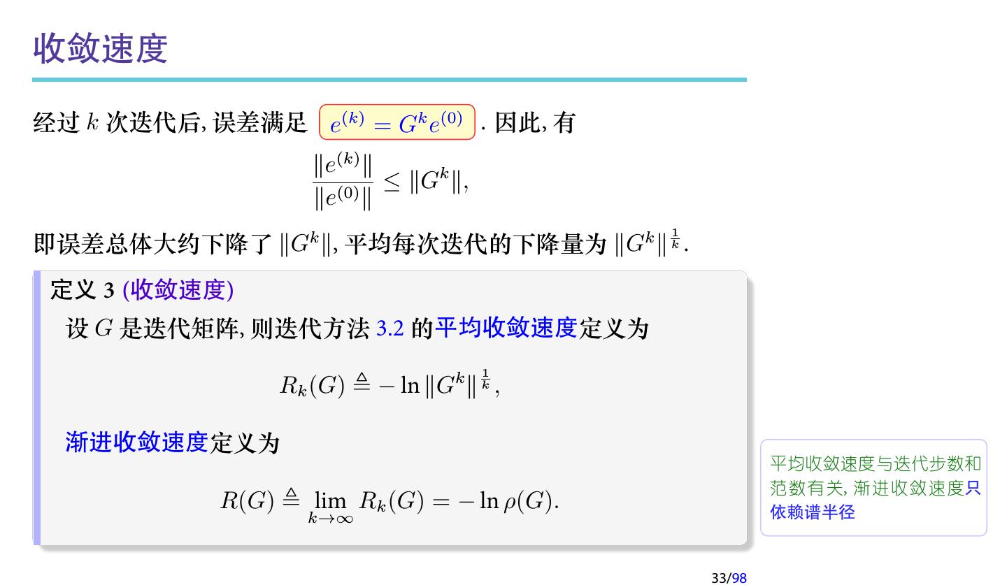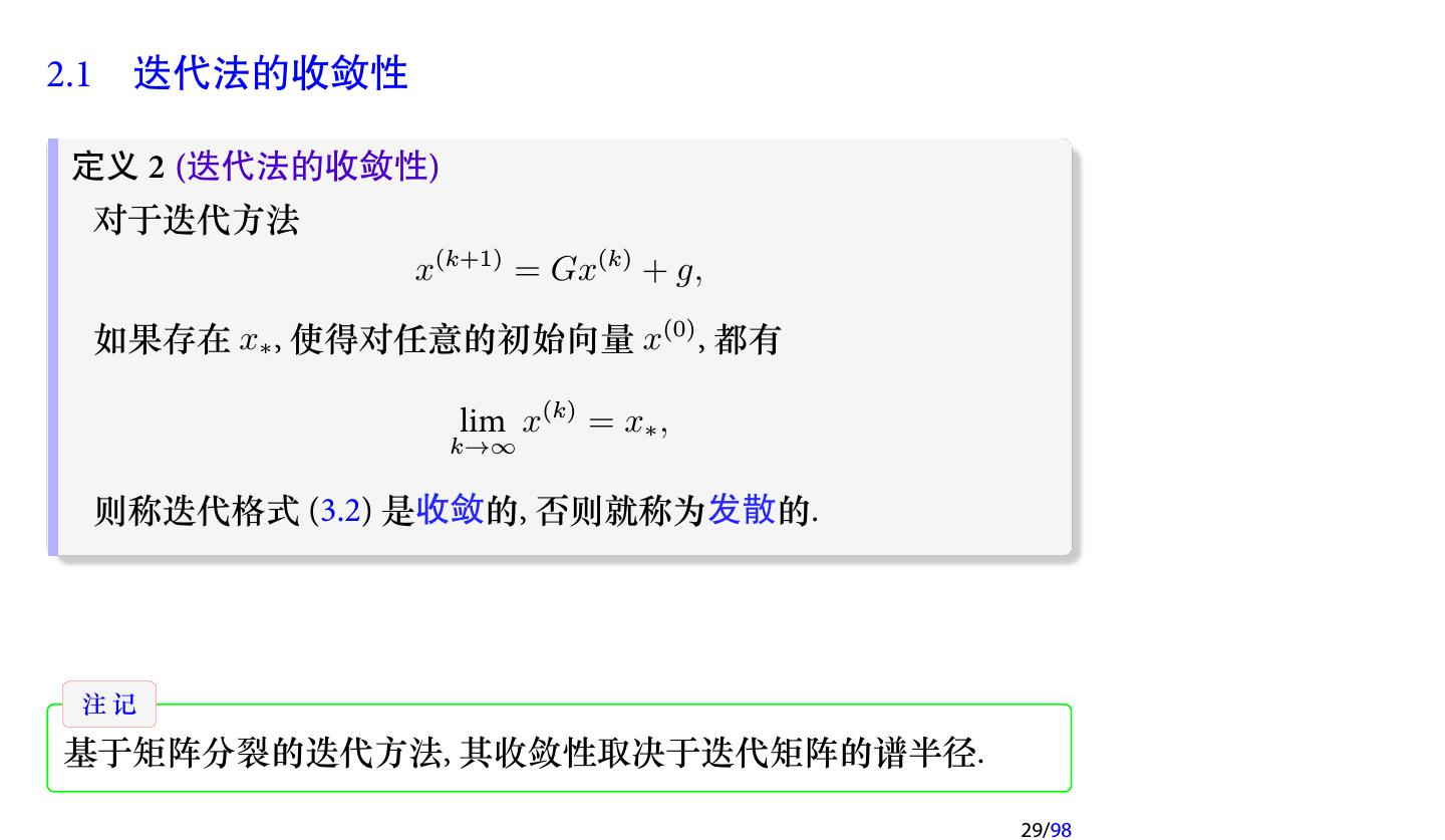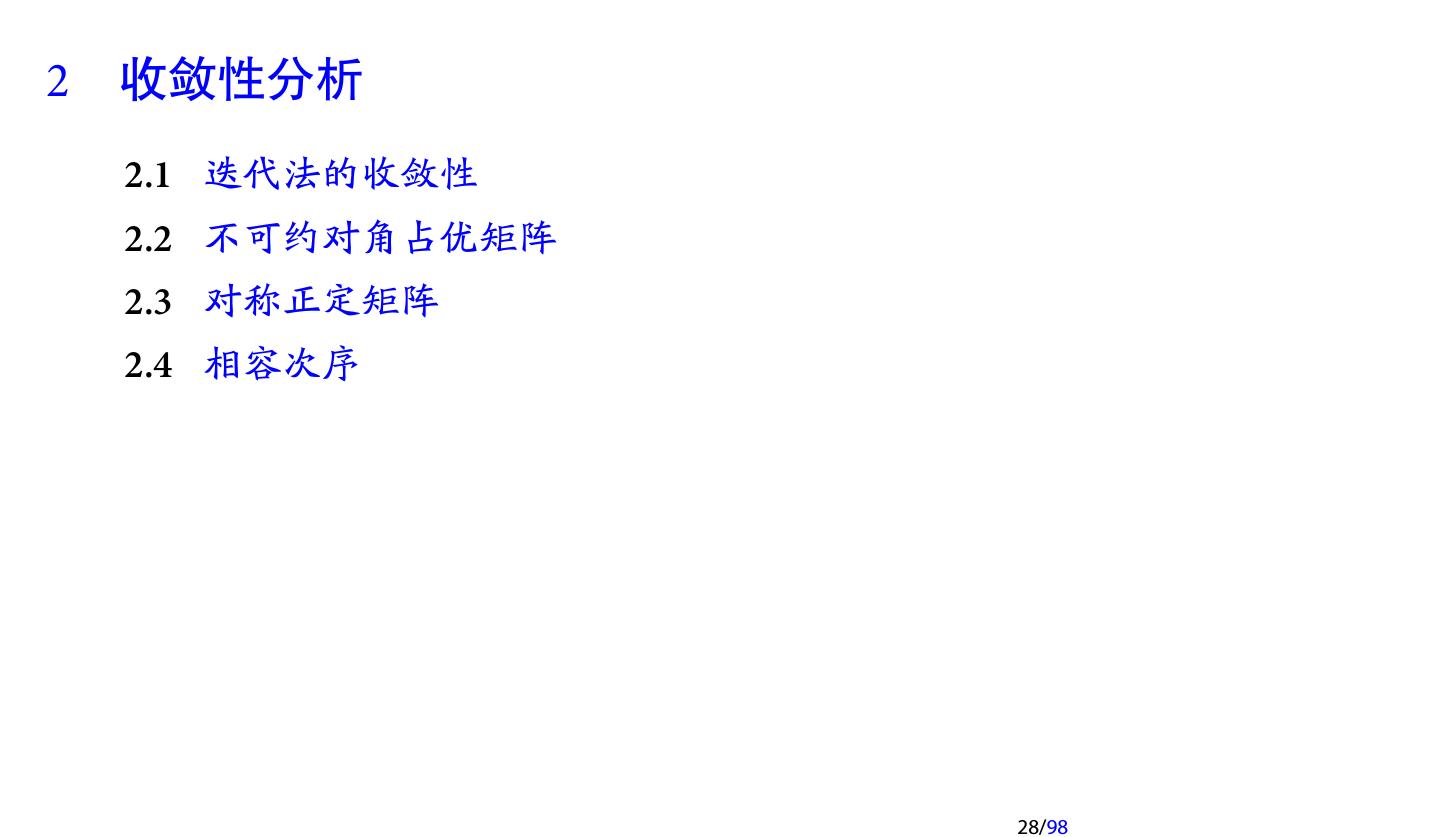 28 .2 收敛性分析 2.1 迭代法的收敛性 2.2 不可约对角占优矩阵 2.3 对称正定矩阵 2.4 相容次序 28/98
